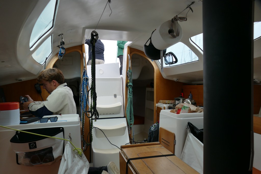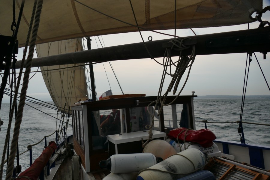Lundi 25 août. 08h45 La Croix du Sud III quitte le port de Granville à destination de Cherbourg, son port d’attache. A son bord, Yael (patronne) Pascal, Etienne et Pablo. Vent Sud Est 11 noeuds, mer belle. SOG 6 noeuds. En route au 20° soleil et excellente visibilité.
