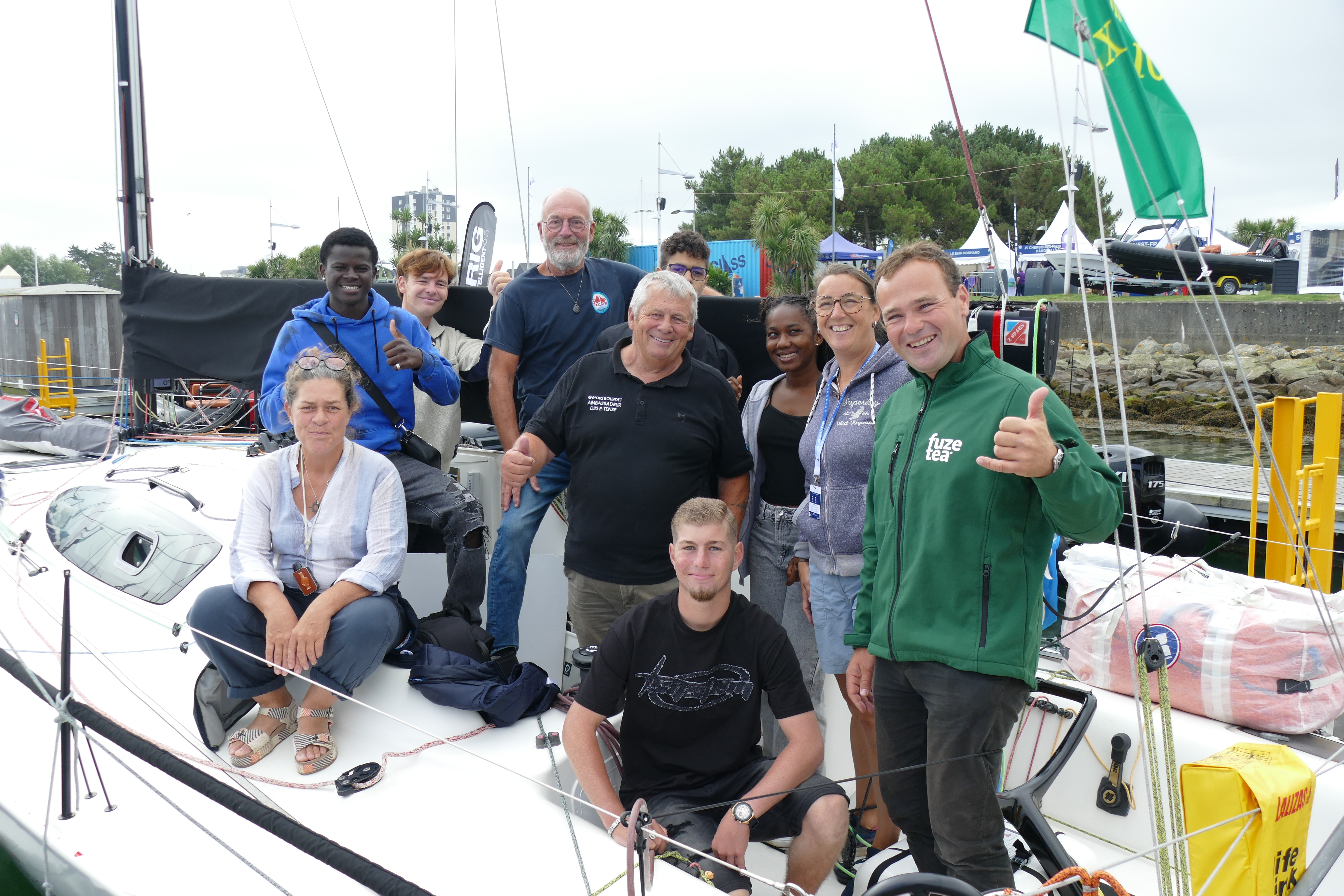 De G. à Dr. Franck, Jean-Marie, Yael, Thierry, Dominique, Gérard, Nils et Jacques – Photo Lucien CaronAvec les jeunes du dispositif 16- 18 de l’AFPA Cherbourg et leur accompagnatrice – photo JM Dean/Voiles écarlates