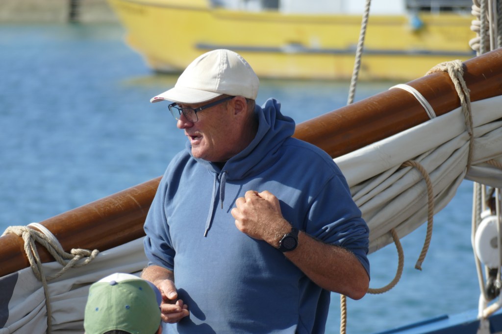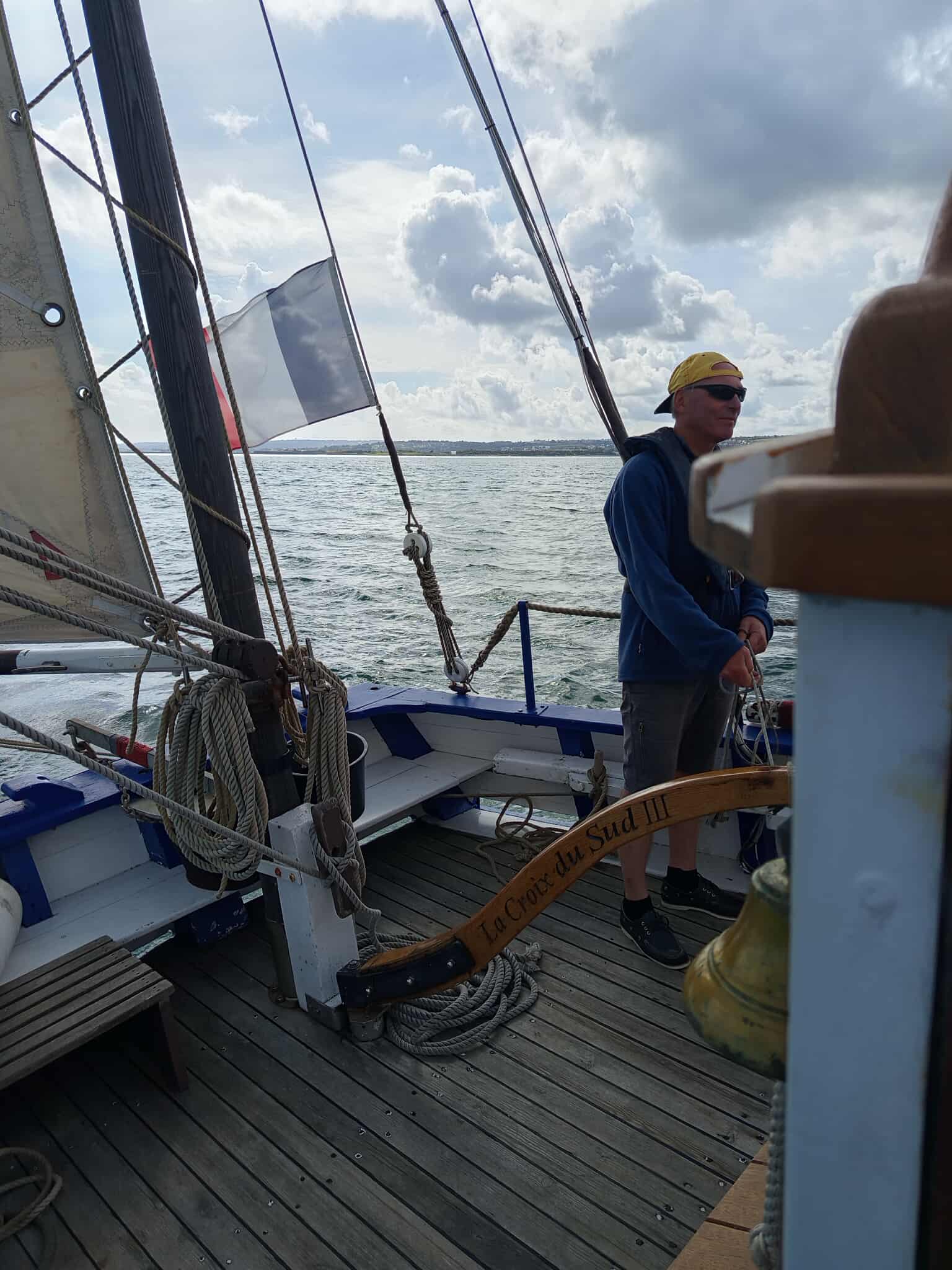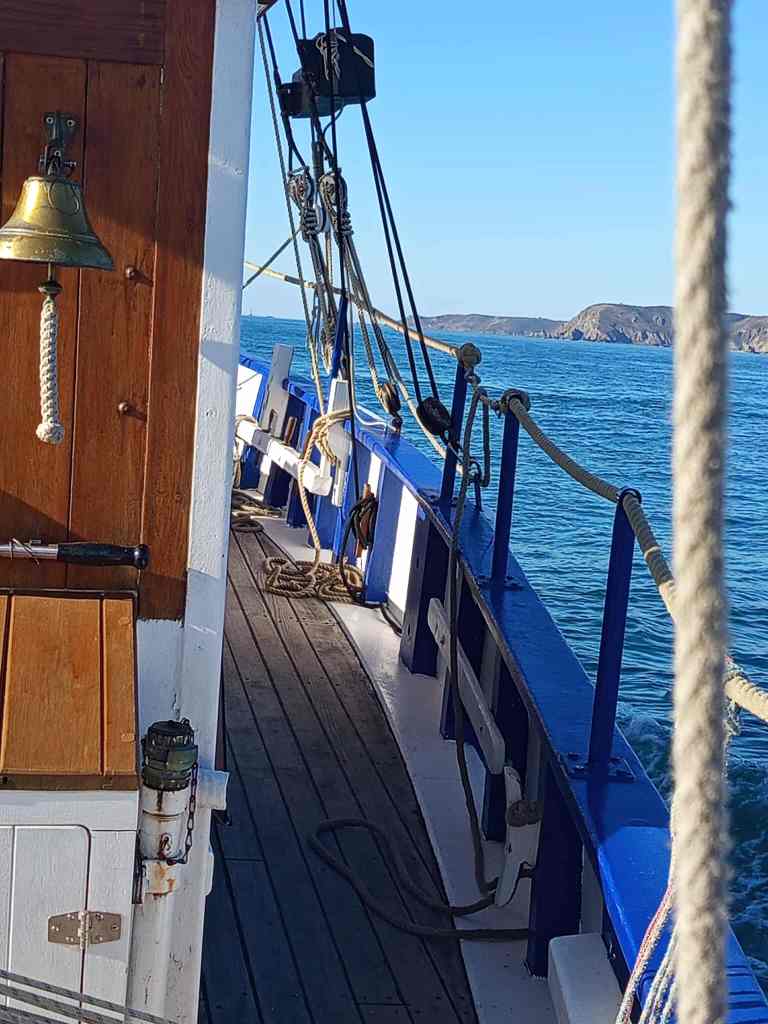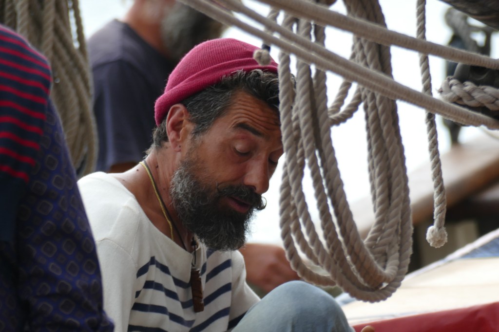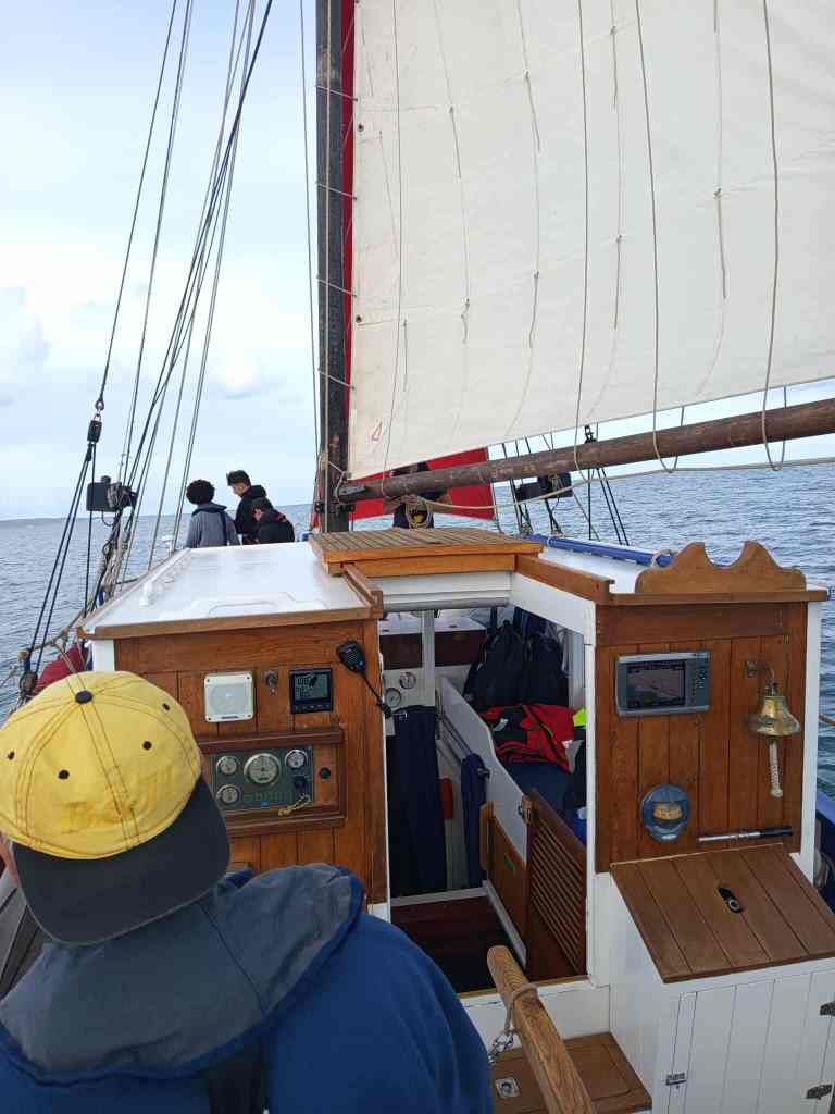 A son bord, Yaël (patronne) Pascal le bosco, Thierry, Jacques, Pablo, Etienne et Jean-Marie. L’ancien langoustier de Camaret, sous GV trinquette, foc et tapecul, a fait route au 188° sous un ciel couvert, avec un vent de Nord Est 10 noeuds, la mer étant belle à peu agitée.