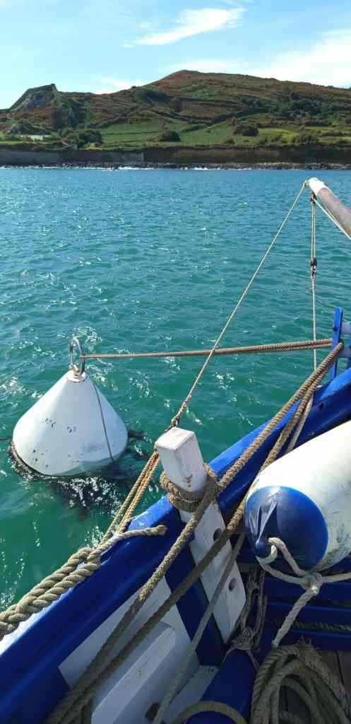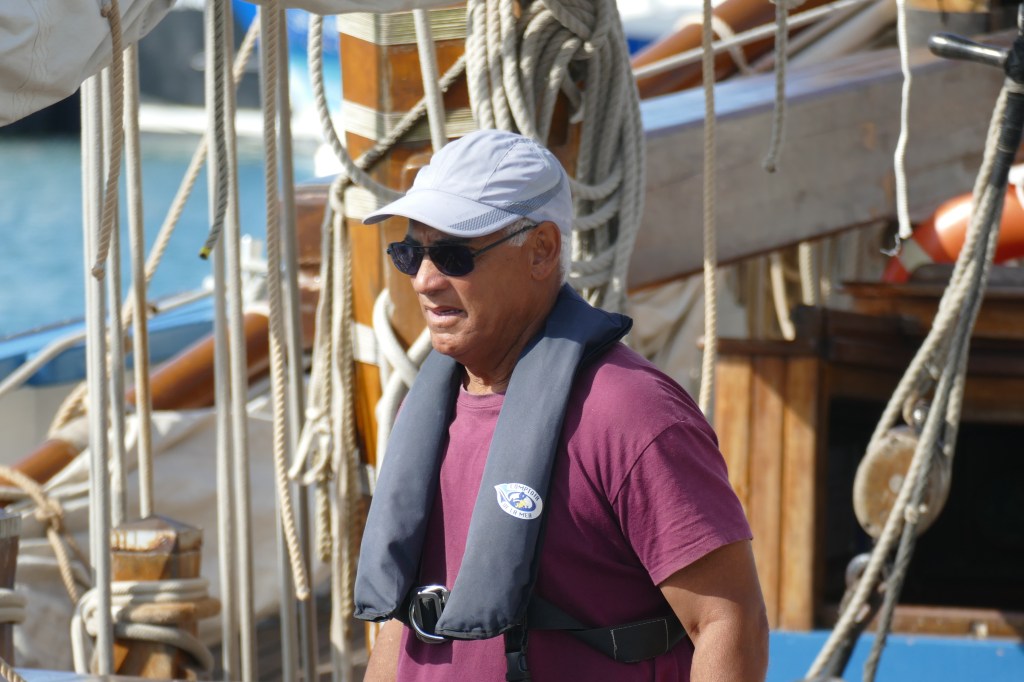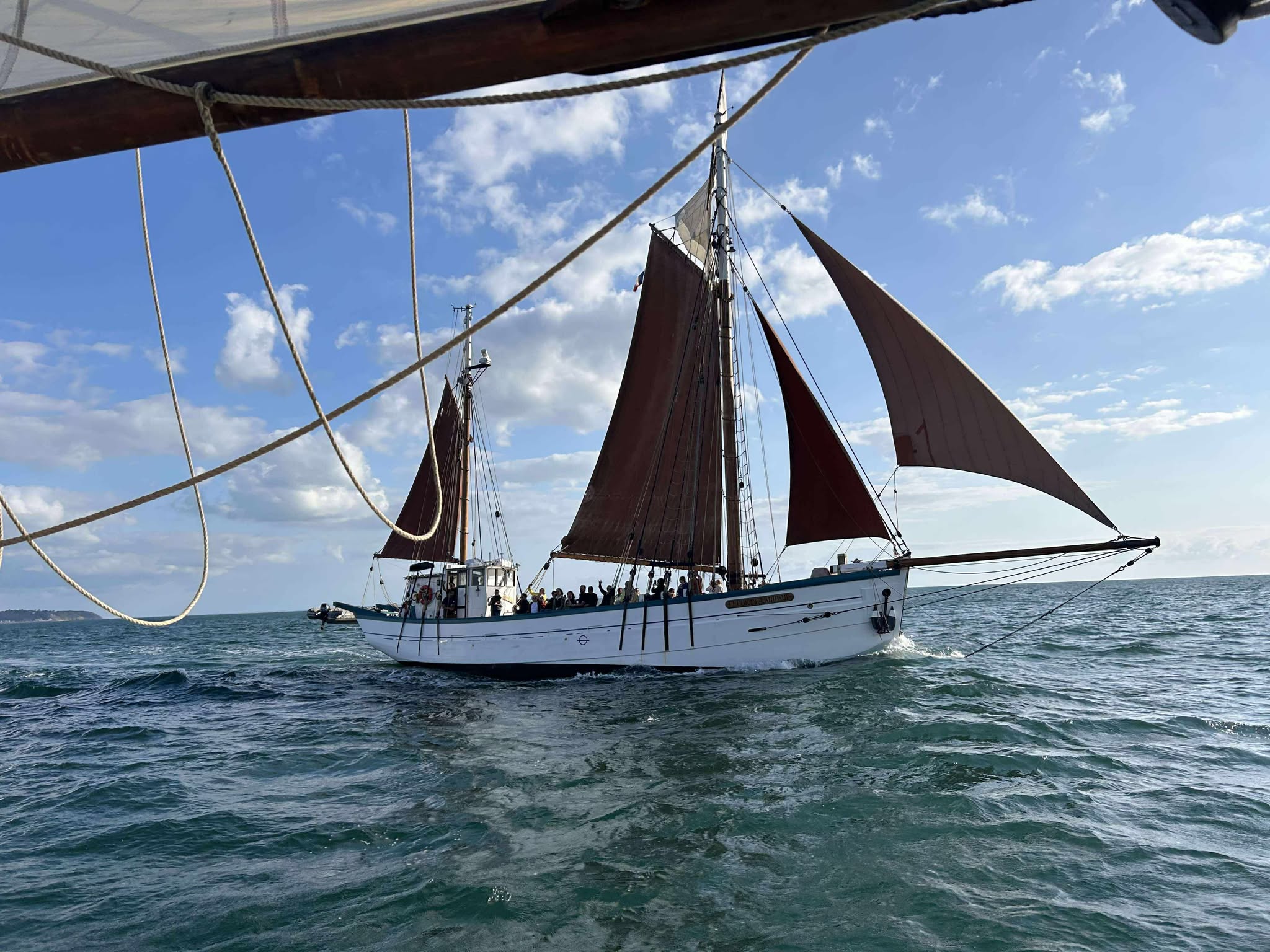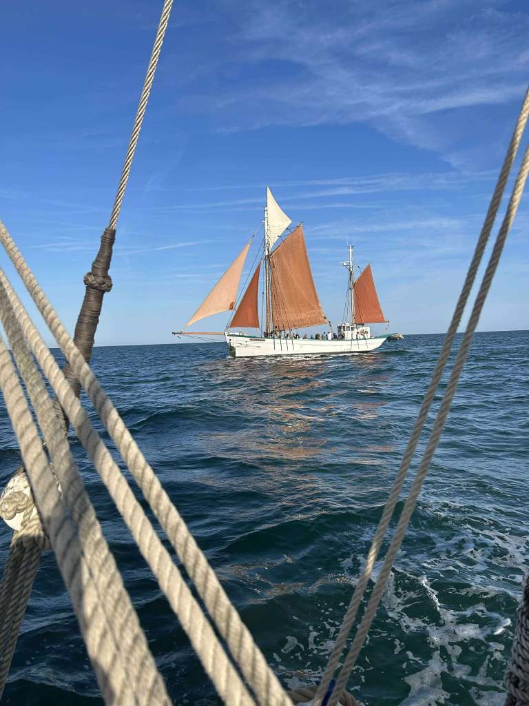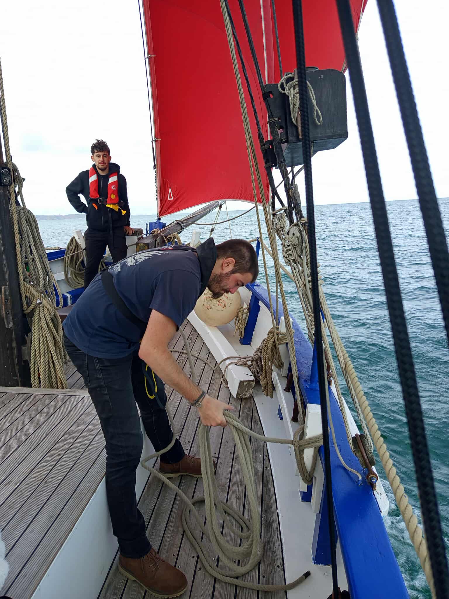 A son bord, Yaël (patronne) Pascal le bosco, Thierry, Jacques, Pablo, Etienne et Jean-Marie. L’ancien langoustier de Camaret, sous GV trinquette, foc et tapecul, a fait route au 188° sous un ciel couvert, avec un vent de Nord Est 10 noeuds, la mer étant belle à peu agitée.