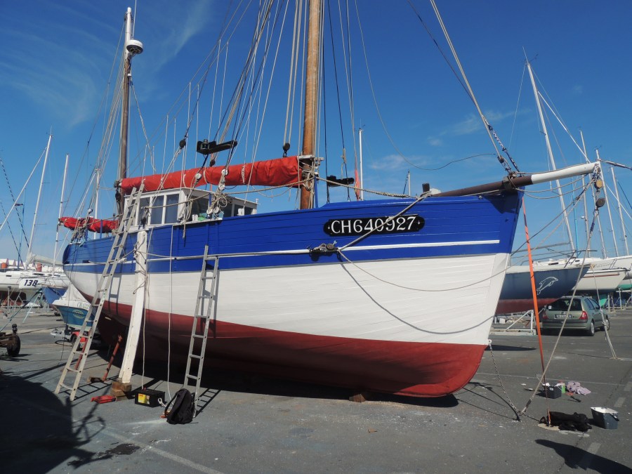 Temps idéal donc pour passer une deuxième couche de blanc sur les oeuvres mortes, faire les finitions du liston, compléter l’antifouling sur les quatre parties masquées sur les oeuvres vives et, dans la foulée, changer la liaison cablot – chaine sur la ligne de mouillage.