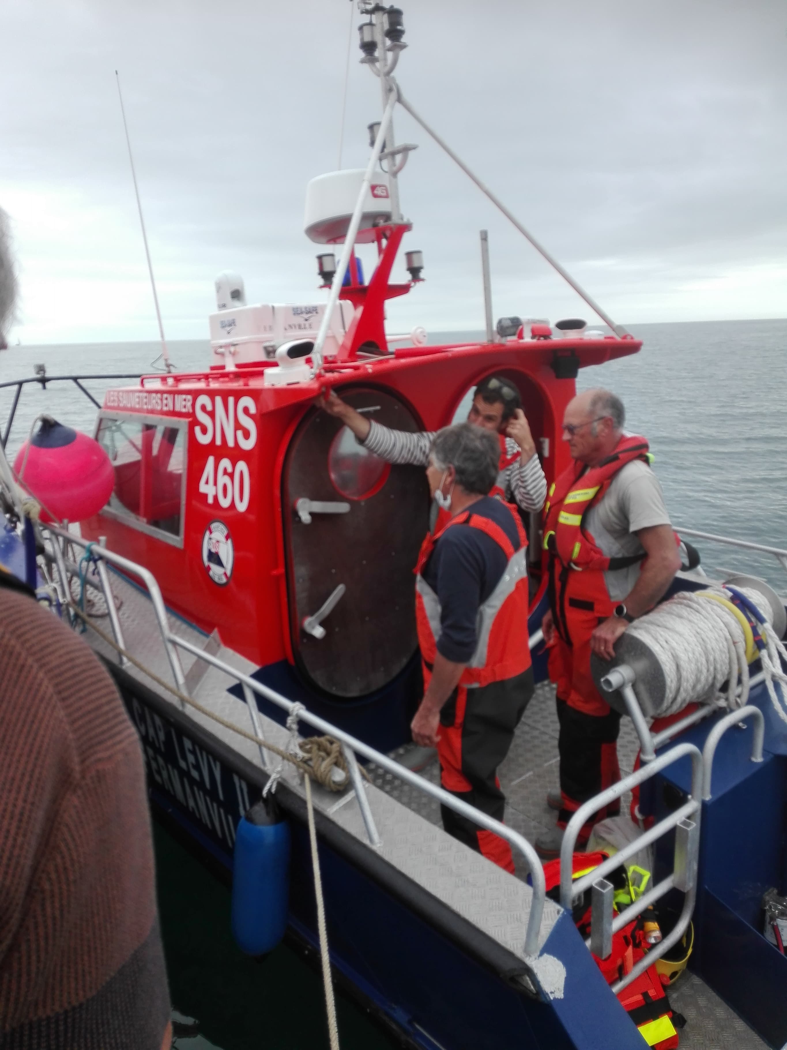 Dimanche 6 juin 2021, la Croix du Sud III a participé à un exercice de sauvetage au large de Cherbourg avec la vedette SNS 460 Cap Levy de la station SNSM de Fermanville.