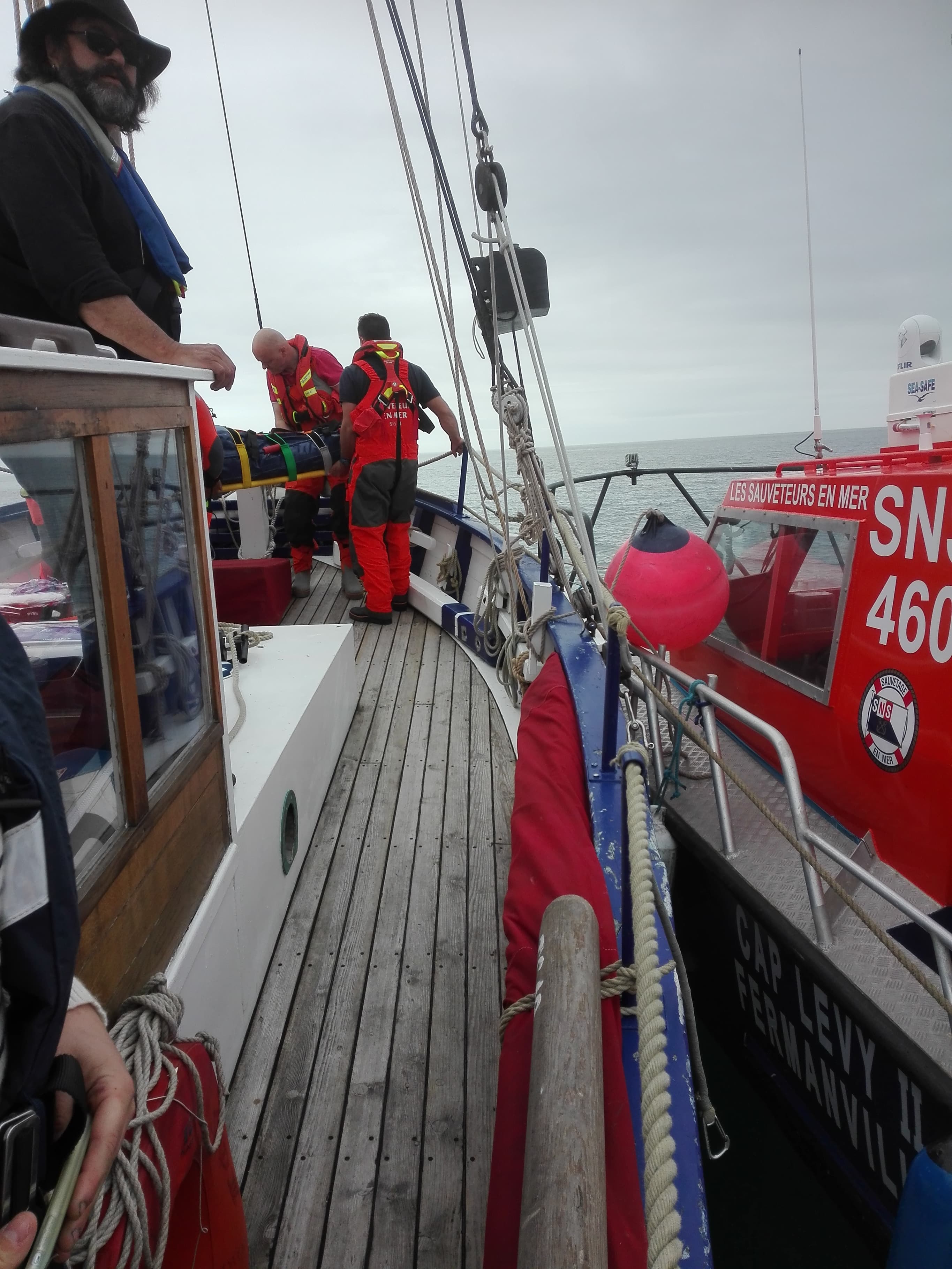 Cet exercice a notamment consisté à évacuer un membre de l’équipage de la Croix du Sud III, blessé. Le côtre dundee de l’association a également été remorqué par la SNS 460;