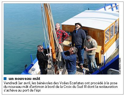 Ce matin, ils étaient huit aux petits soins du nouveau mât de la Croix du Sud III. Après la pose du mât d’artimon, le 1er avril dernier, le bateau a donc retrouvé son élégante silhouette en se dotant d’un nouveau mât conçu par les charpentiers de marine du Lycée Doucet d’Equeurdreville. Trois d’entre eux, Eric, Erwann et Jeremy, étaient présents quai de la misaine à port Chantereyne pour procéder à la mise en place de leur oeuvre. Du beau travail !