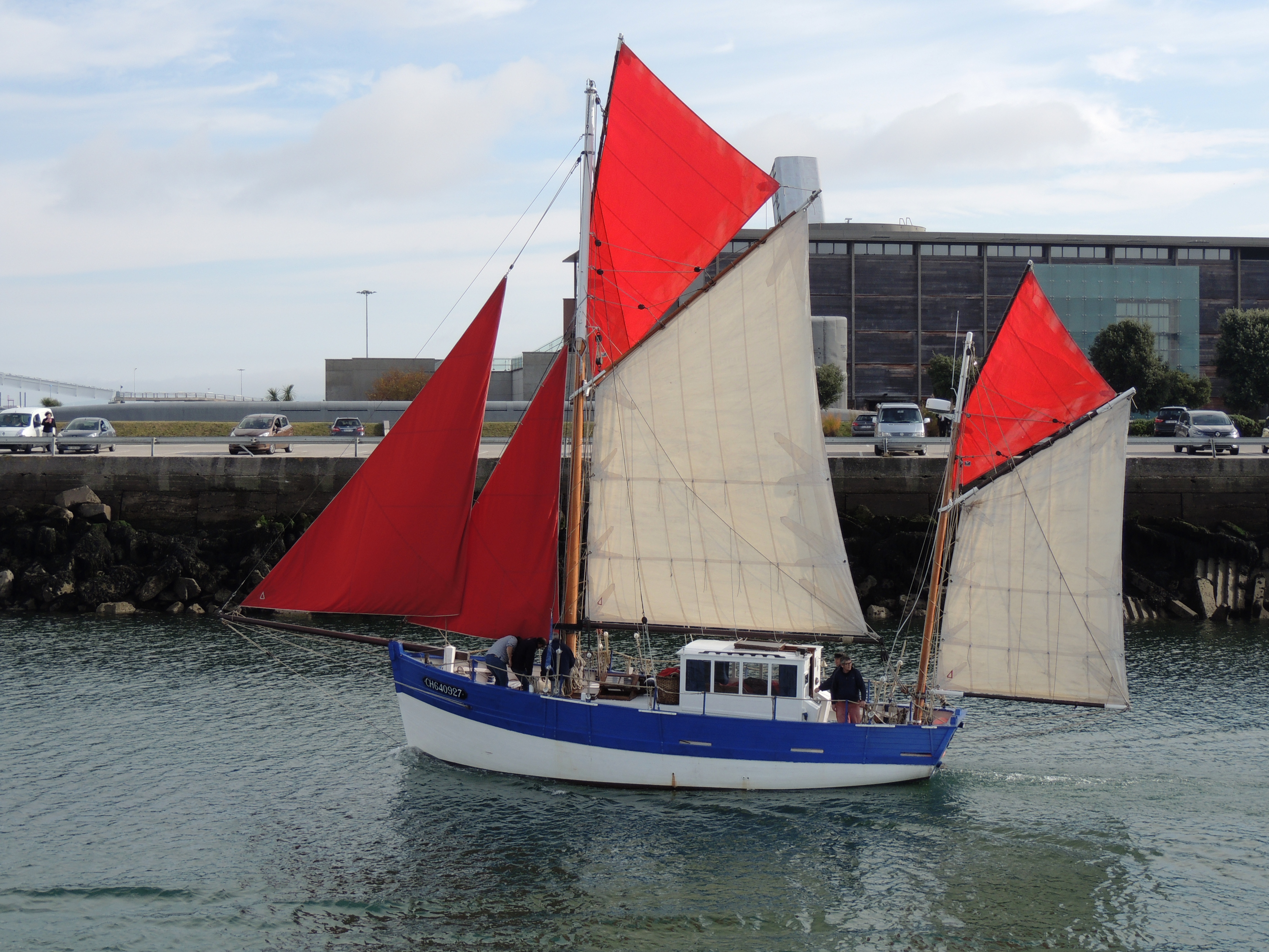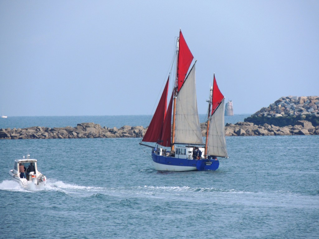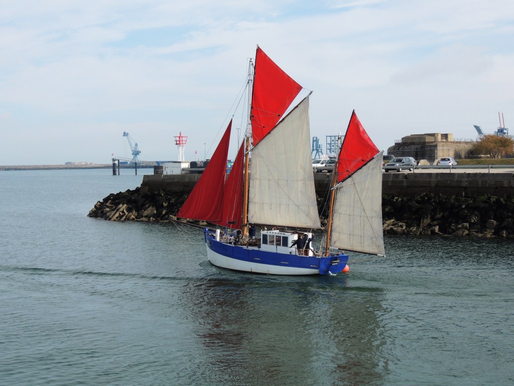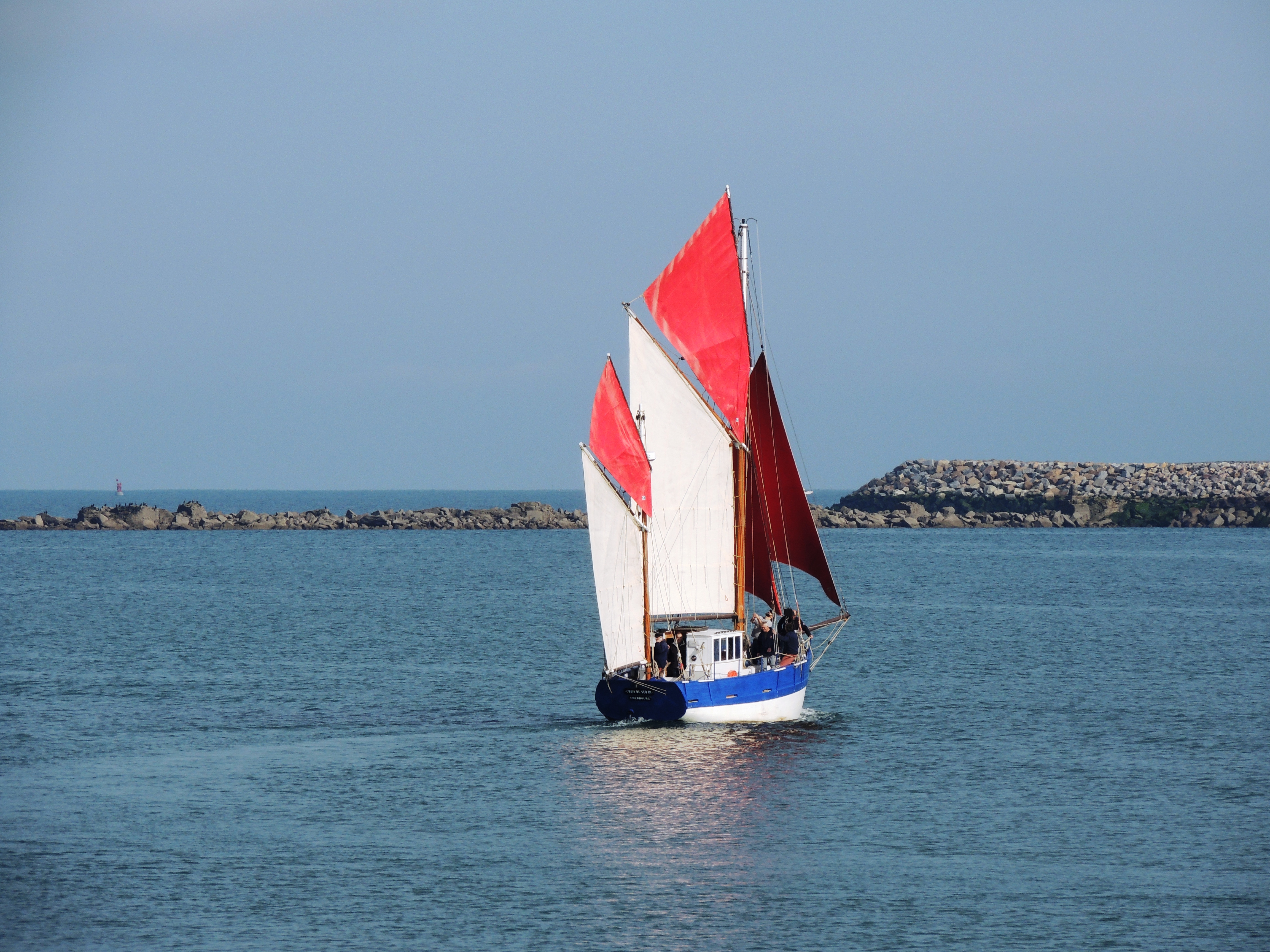 Sortie de la Croix du Sud III avec quelques jeunes du centre du Bigard. Le bateau a repris ses activités régulières. Aujourd’hui, envoi et établissement des deux flèches. Les quatre voiles écarlates, symboles de l’association, ont fini de déchirer sans peine les lambeaux de brume qui planaient encore sur la rade ce matin…