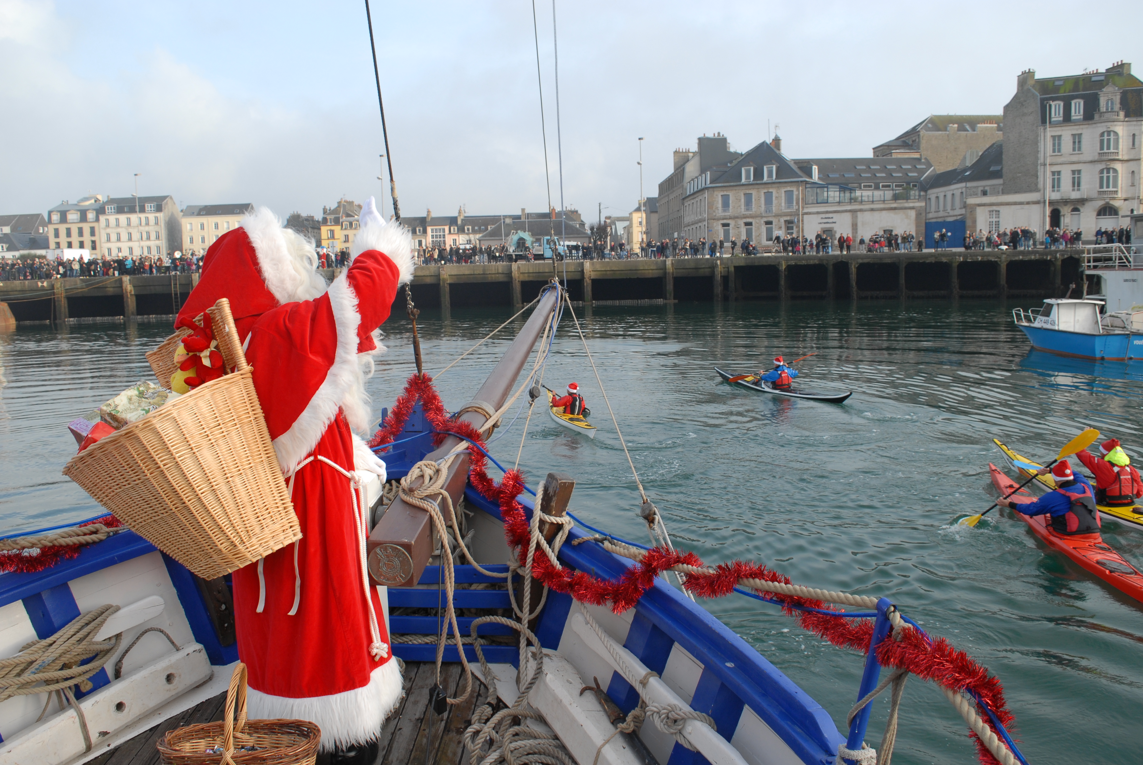 En provenance des hautes latitudes, après une longue navigation à bord de la Croix du Sud III, le Père Noël est arrivé à bon port cet après midi, escorté par le club de kayak de mer de Cherbourg. Attendu par une foule nombreuse réunie dans l’avant port, il a mis pied à terre au quai Lawton Collins.