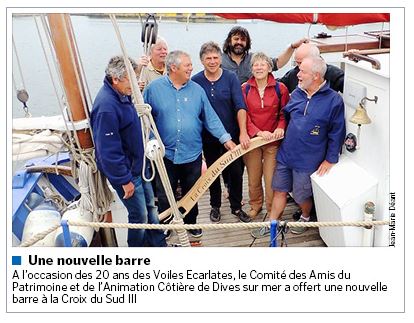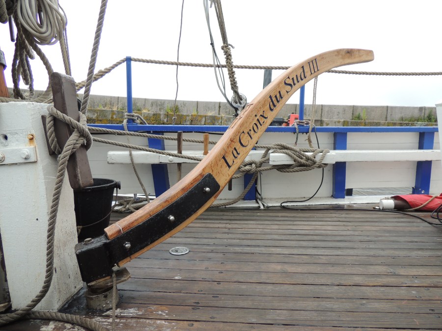 Superbe et gravée en creux, traitée à l’huile de lin, Croix du Sud III montre fièrement sa nouvelle barre en chêne de Normandie. Encore merci à nos cousins du CAPAC pour ce somptueux cadeau offert à l’occasion du 20ème anniversaire des Voiles Écarlates.