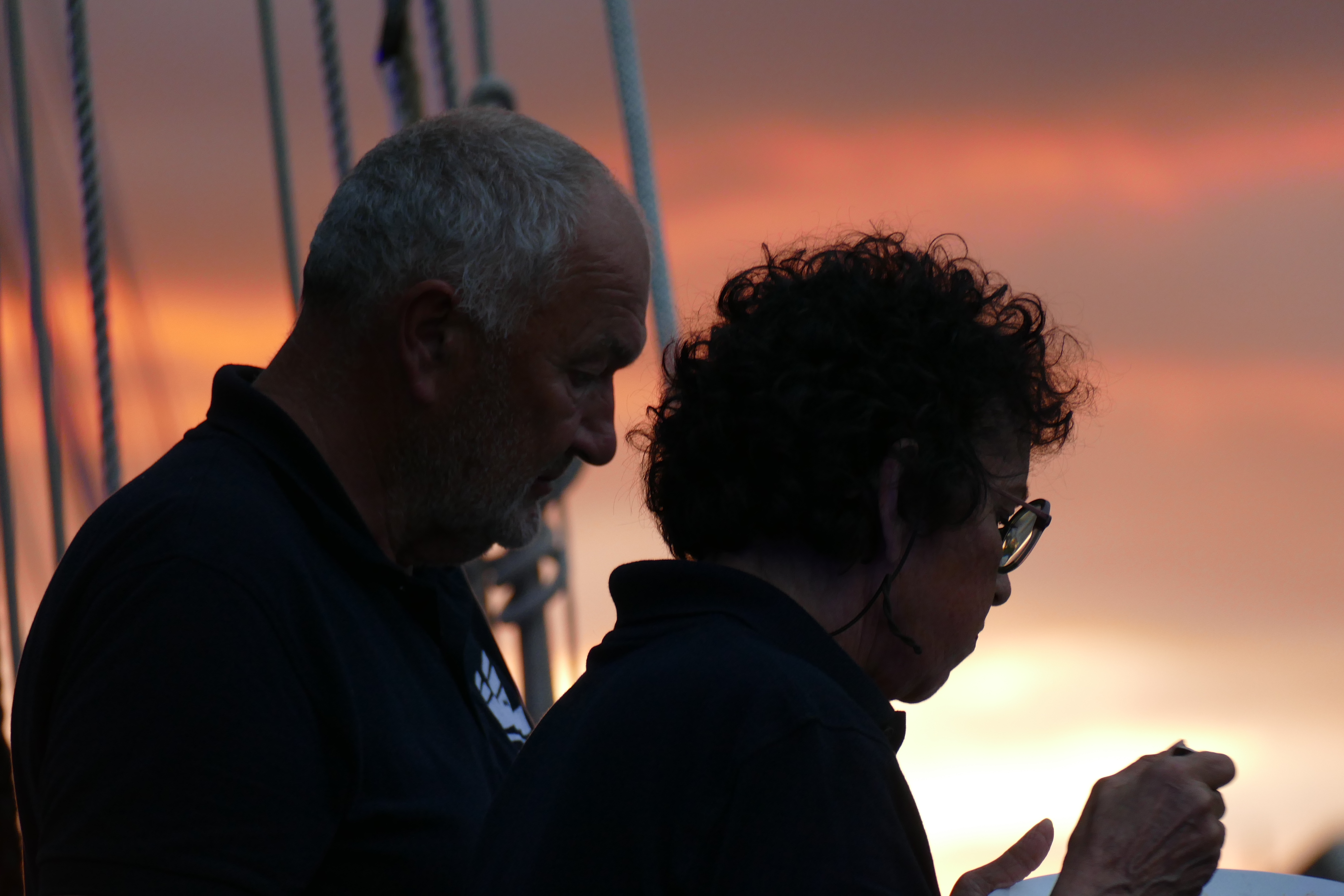 A son bord, Yaël (patronne) Pascal le bosco, Thierry, Jacques, Pablo, Etienne et Jean-Marie. L’ancien langoustier de Camaret, sous GV trinquette, foc et tapecul, a fait route au 188° sous un ciel couvert, avec un vent de Nord Est 10 noeuds, la mer étant belle à peu agitée.