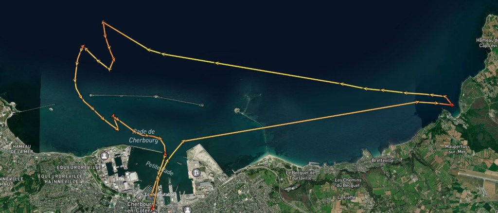 Mercredi 25 juin, appareillage 10h25, vent NE mer belle 11h00 envoyé les deux flèches. 11h15 au Nord de la célèbre pointe du Hoc. 13h30 rencontre avec un groupe de 15 à 20 tursiops dont certains viennent jouer à l’étrave. Route de conserve avec La Nébuleuse, et, un peu plus Nord, la Recouvrance.17h05 affalé les voiles. 17h25 chenal de Ouistreham. 18h15 amarré babord ponton d’attente du sas. Parcouru 37,3 nautiques.