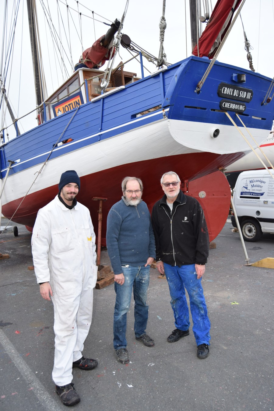 Alors que les travaux se poursuivent à bord de la Croix du Sud III pour ce qui concerne la mise en place du nouveau moteur et pendant que les entreprises Mécanique Marine et Marelec de St Vaast interviennent, l’équipage en profite pour effectuer des travaux de peinture. Aujourd’hui, c’était Réné, Serge et Tristan qui étaient à la manoeuvre des pinceaux pour procéder à la mise en place de l’antifouling.
