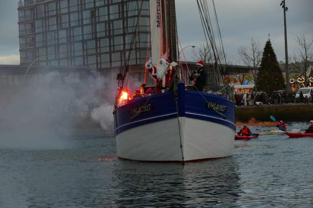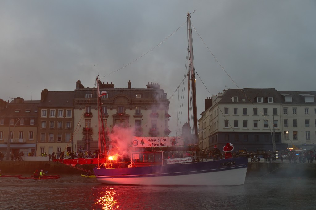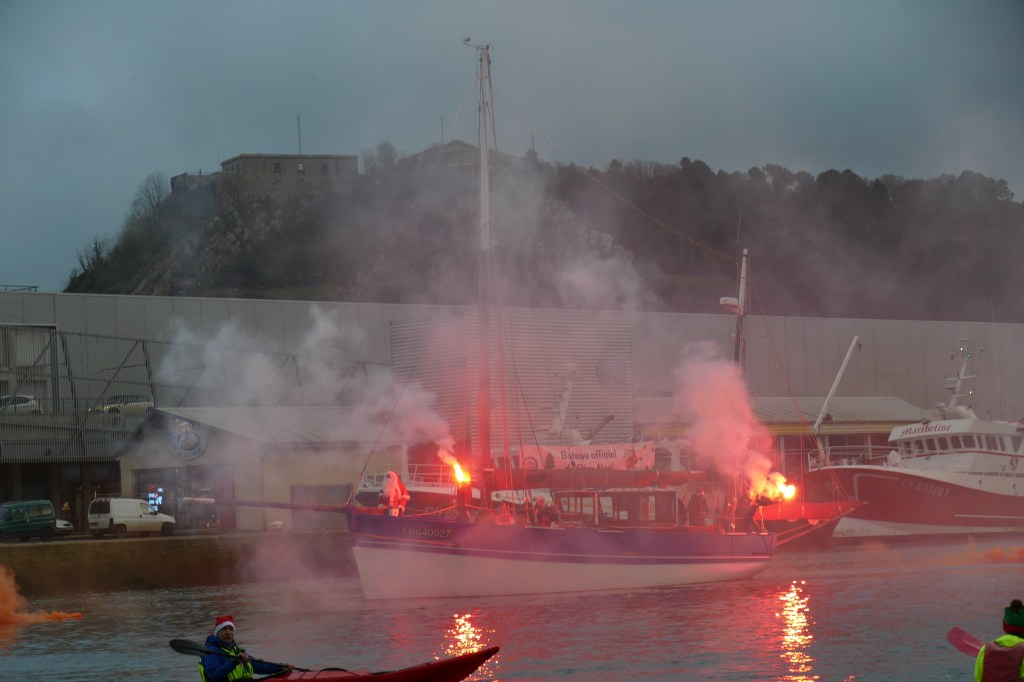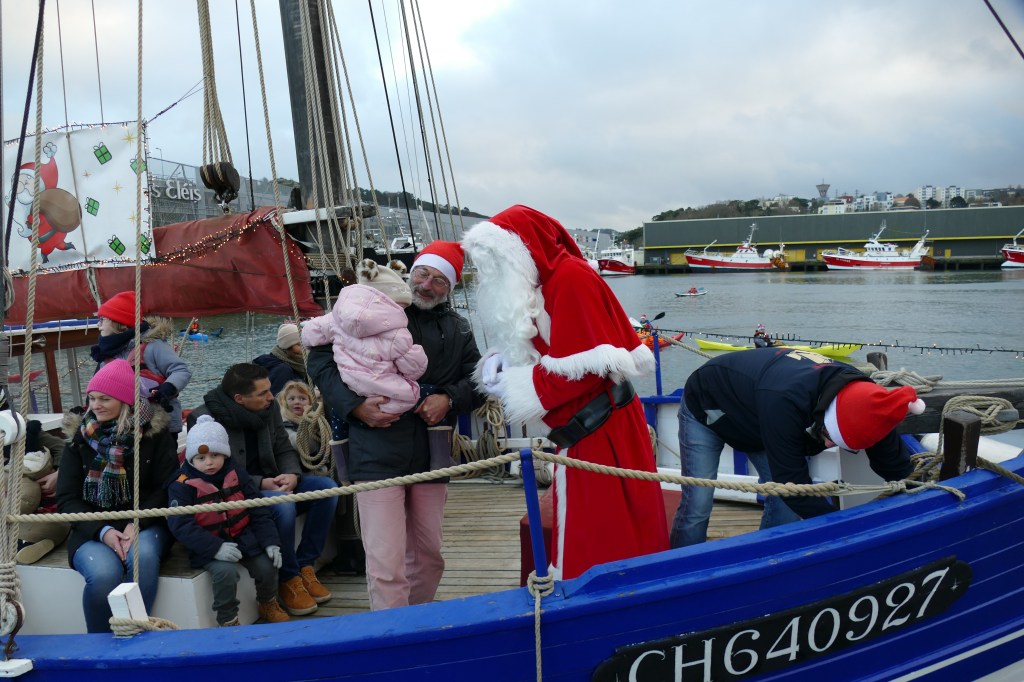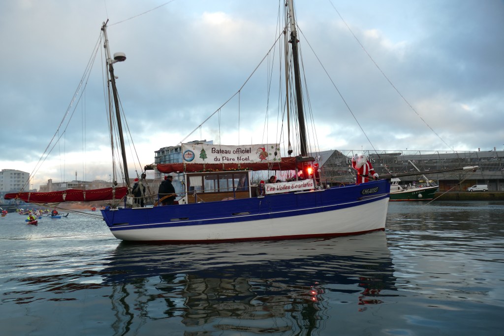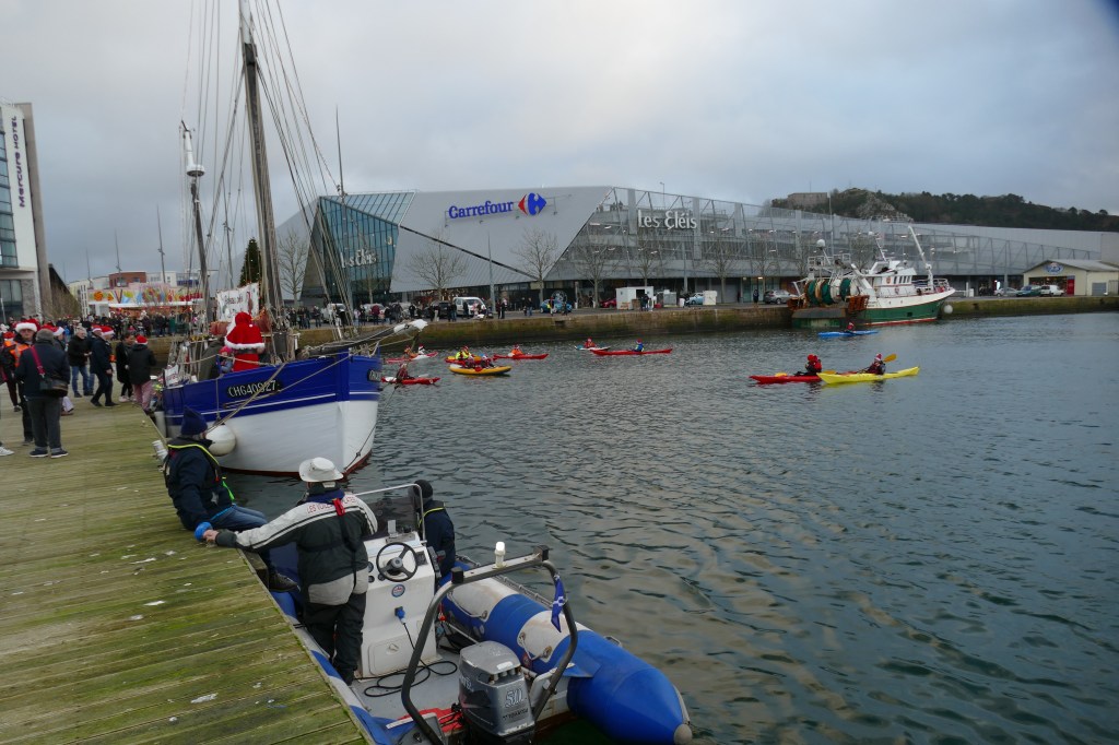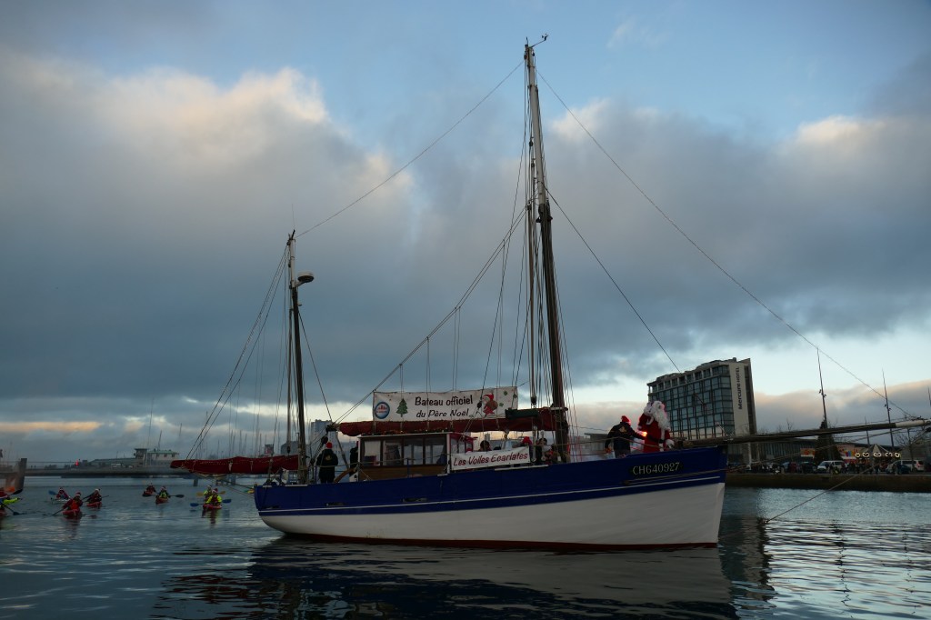 Hier, samedi 23 décembre, il y avait du monde sur les quais autour du bassin du commerce à Cherbourg pour voir embarquer le Père Noël à bord de la Croix du Sud III. Après avoir quitté le ponton de la passerelle Michel Legrand, l’ancien langoustier de Camaret et son illustre passager ont effectué plusieurs boucles dans le bassin en compagnie des lutins – kayakistes avant de se diriger un peu avant 17heures vers l’ouverture du pont tournant et de faire cap vers le Nord, le Père Noël ayant fort à faire du coté des hautes latitudes…
