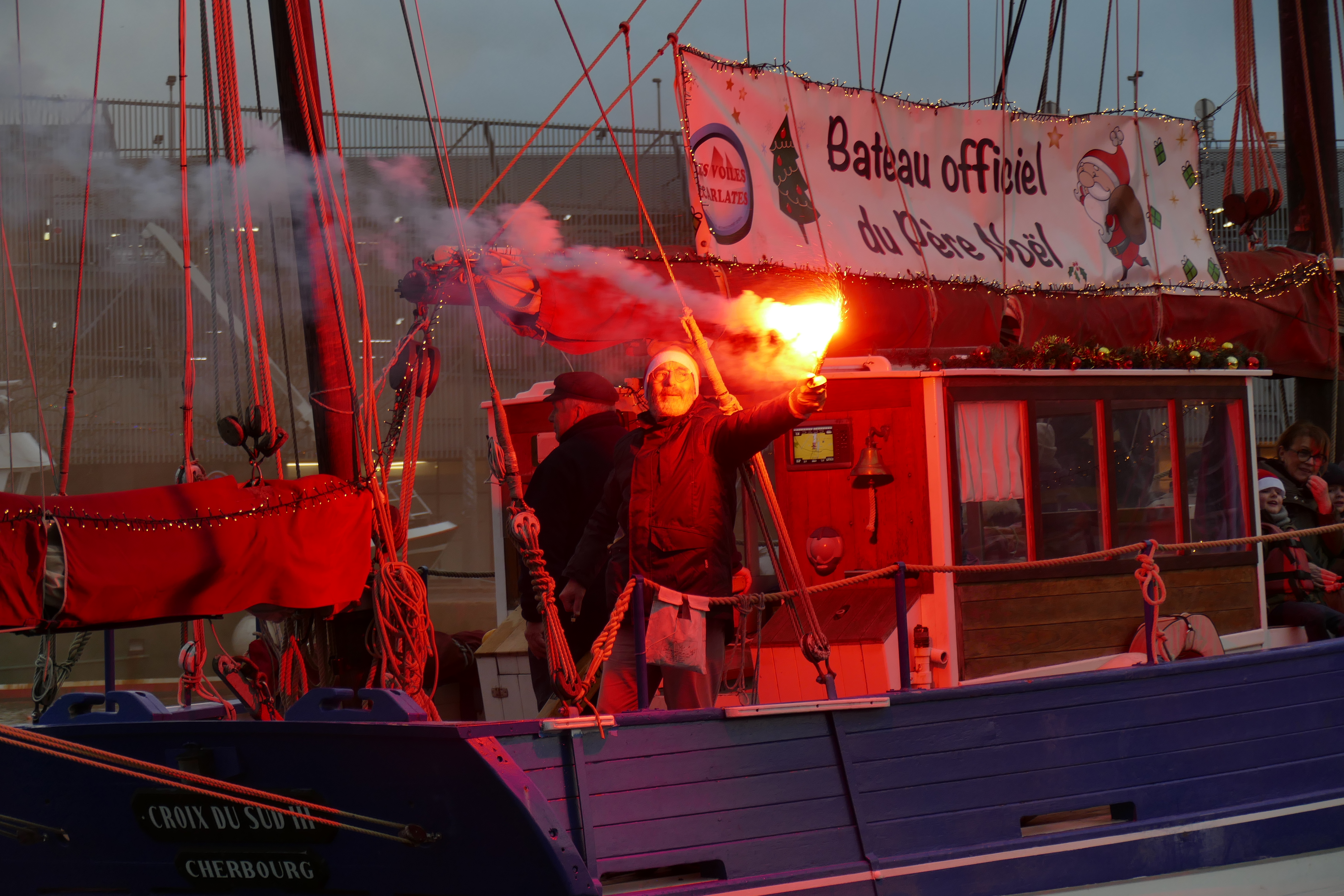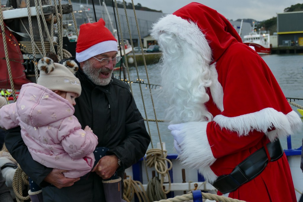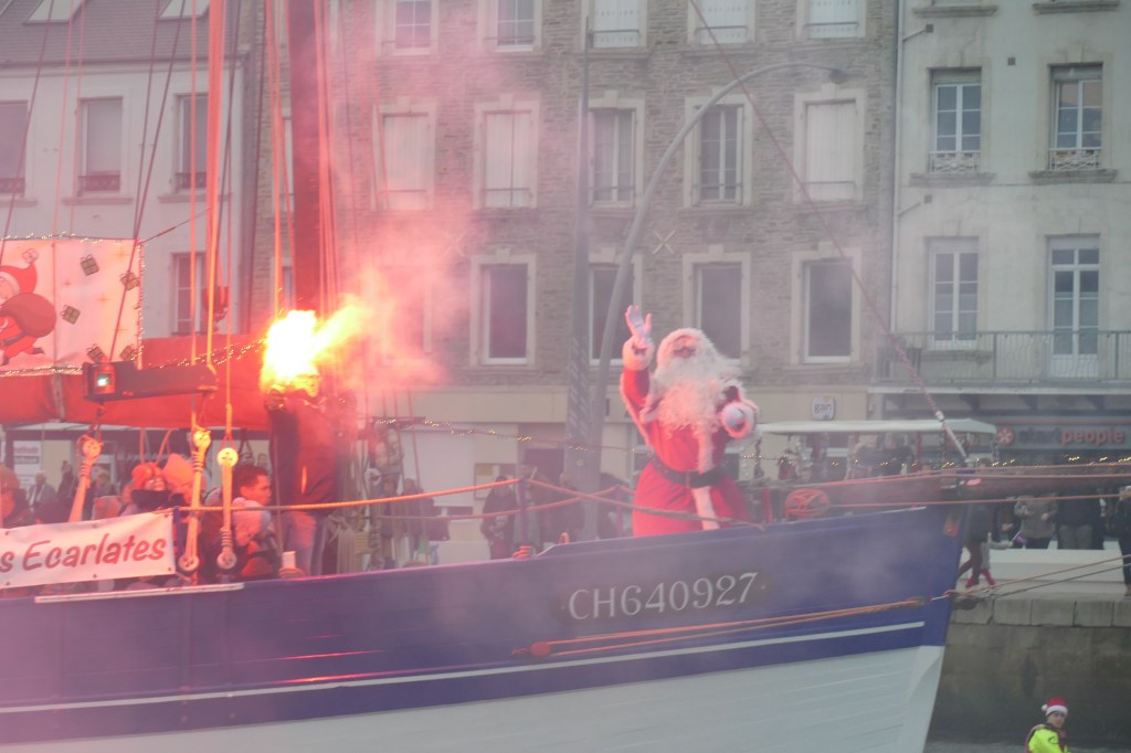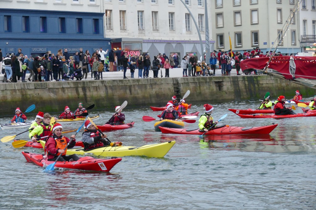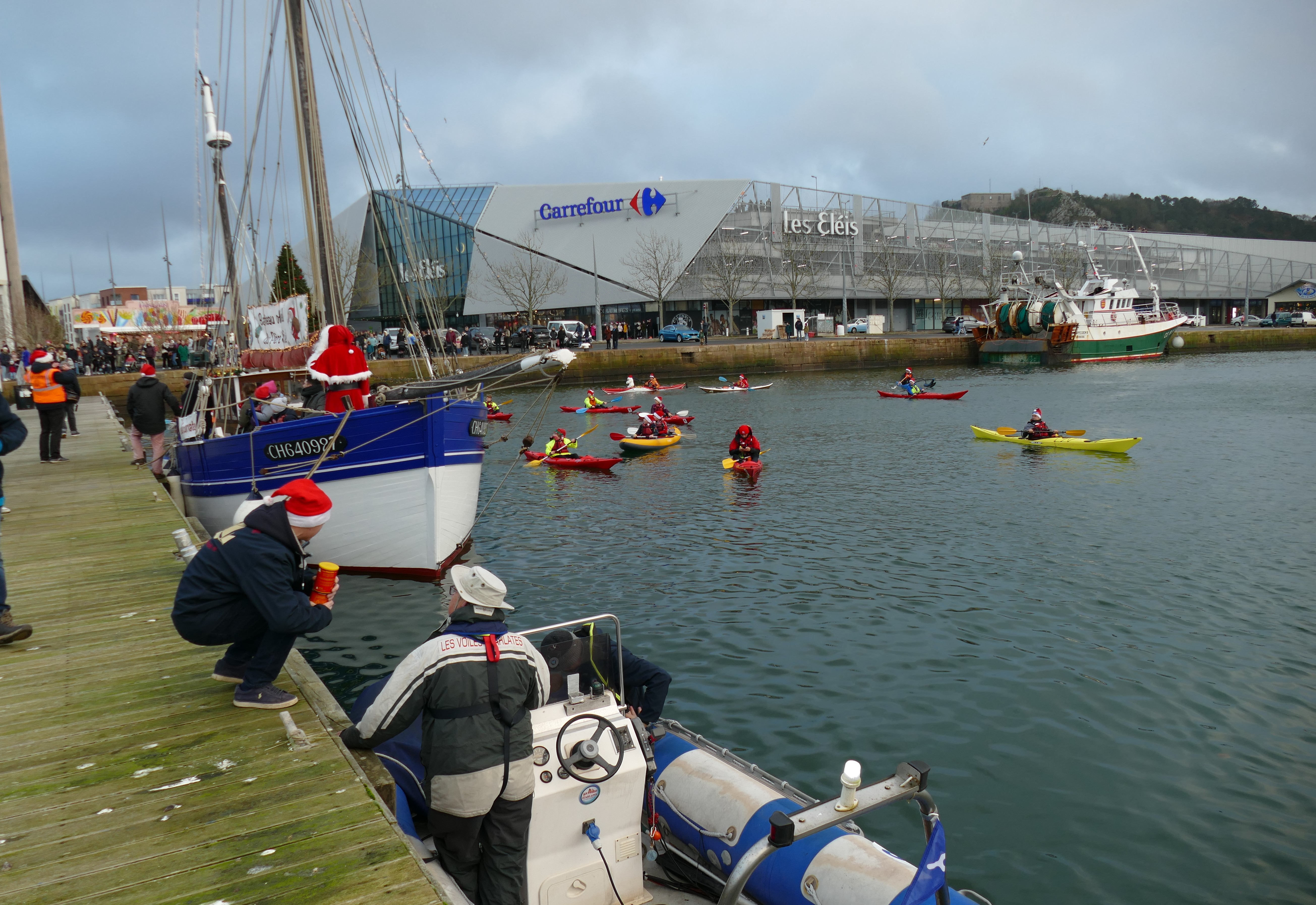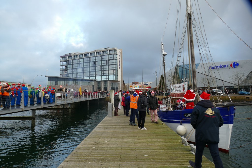 Hier, samedi 23 décembre, il y avait du monde sur les quais autour du bassin du commerce à Cherbourg pour voir embarquer le Père Noël à bord de la Croix du Sud III. Après avoir quitté le ponton de la passerelle Michel Legrand, l’ancien langoustier de Camaret et son illustre passager ont effectué plusieurs boucles dans le bassin en compagnie des lutins – kayakistes avant de se diriger un peu avant 17heures vers l’ouverture du pont tournant et de faire cap vers le Nord, le Père Noël ayant fort à faire du coté des hautes latitudes…