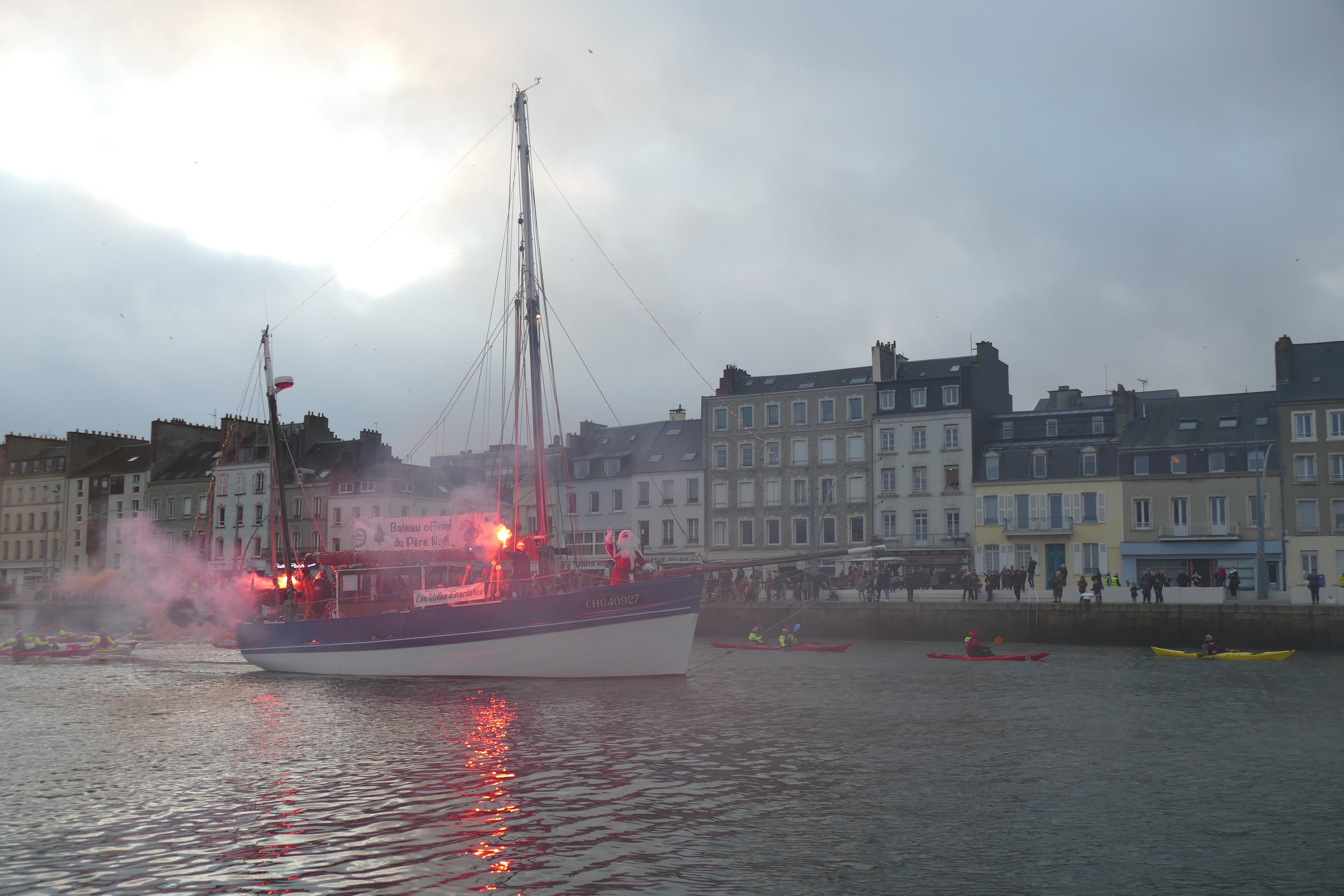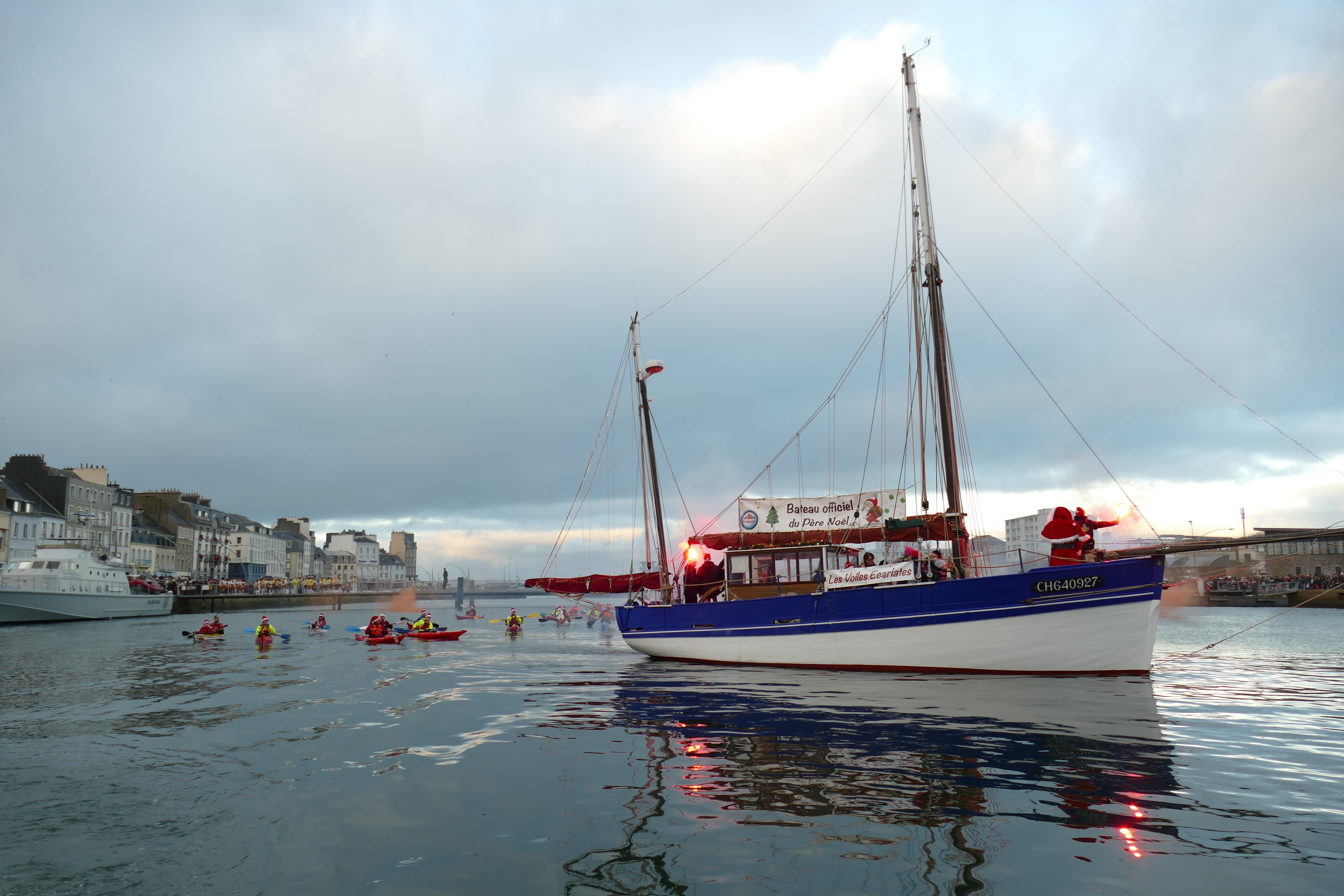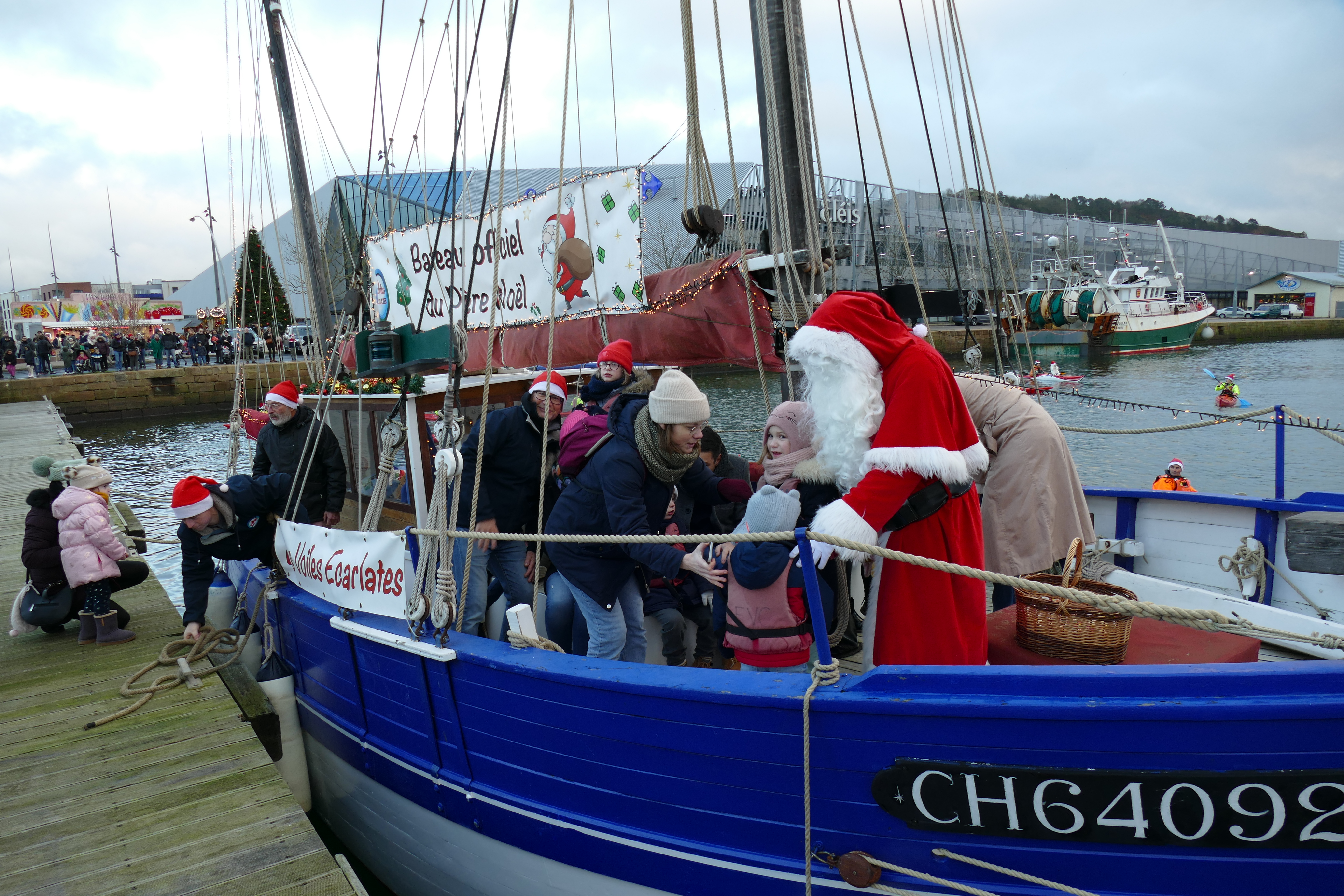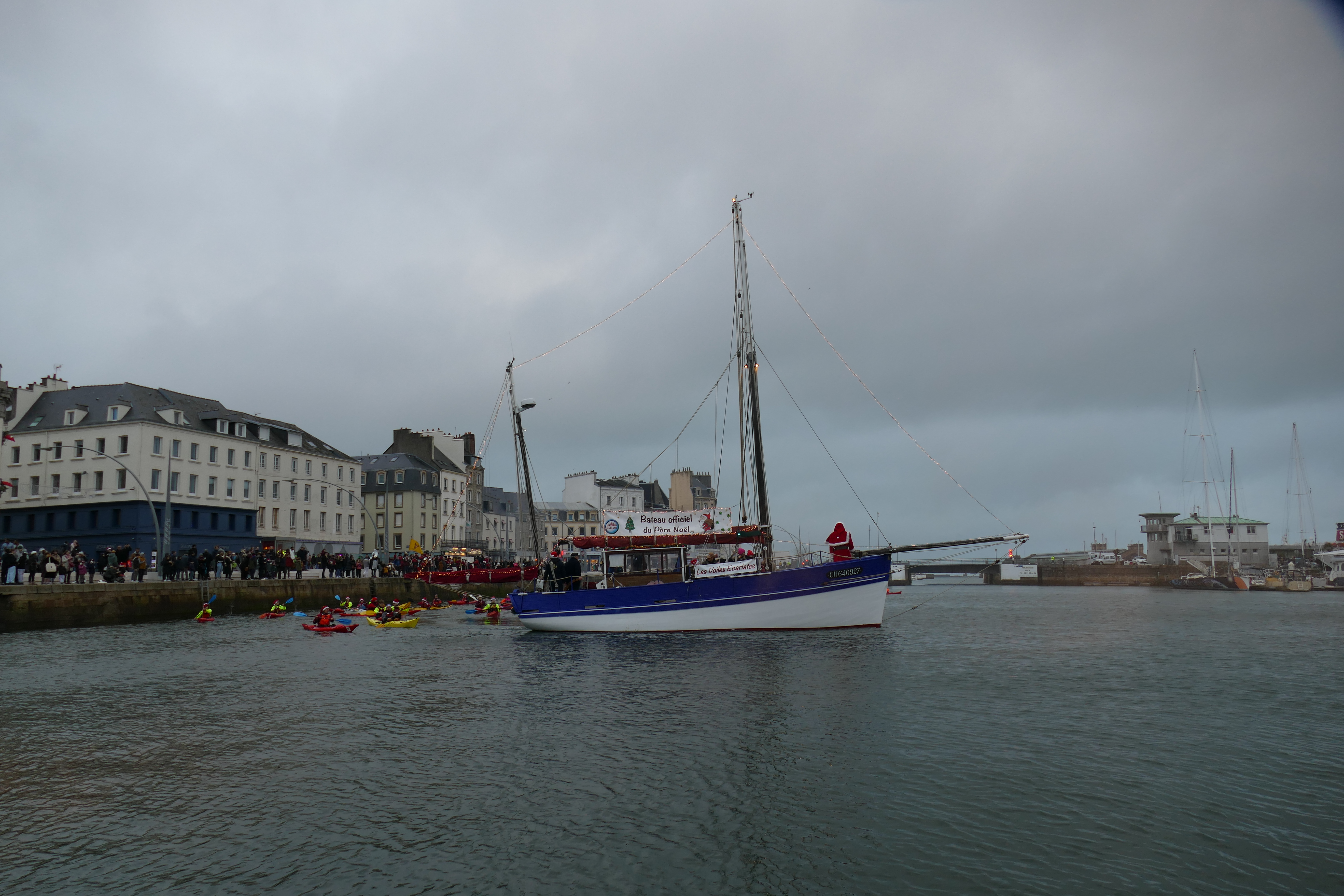 Hier, samedi 23 décembre, il y avait du monde sur les quais autour du bassin du commerce à Cherbourg pour voir embarquer le Père Noël à bord de la Croix du Sud III. Après avoir quitté le ponton de la passerelle Michel Legrand, l’ancien langoustier de Camaret et son illustre passager ont effectué plusieurs boucles dans le bassin en compagnie des lutins – kayakistes avant de se diriger un peu avant 17heures vers l’ouverture du pont tournant et de faire cap vers le Nord, le Père Noël ayant fort à faire du coté des hautes latitudes…