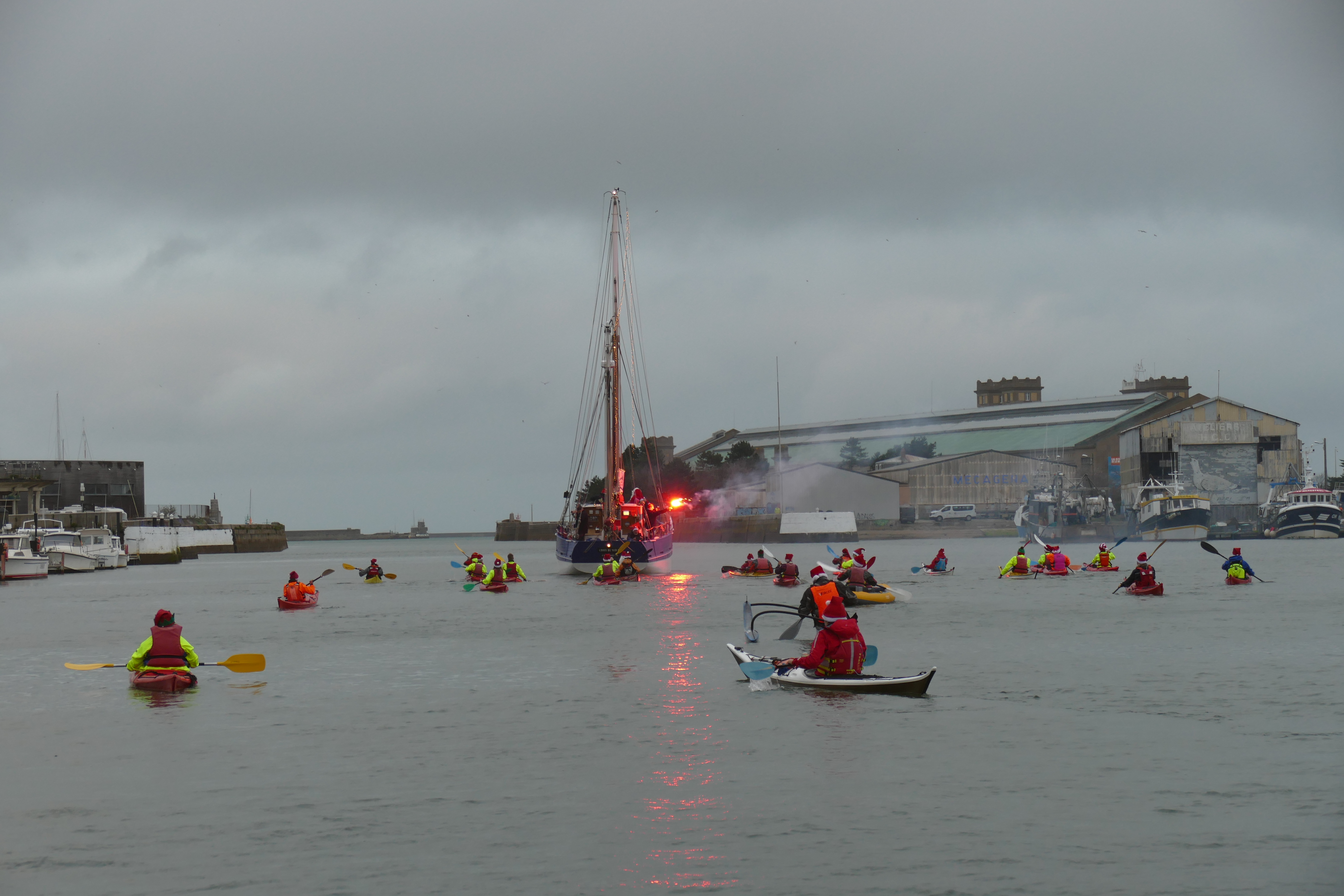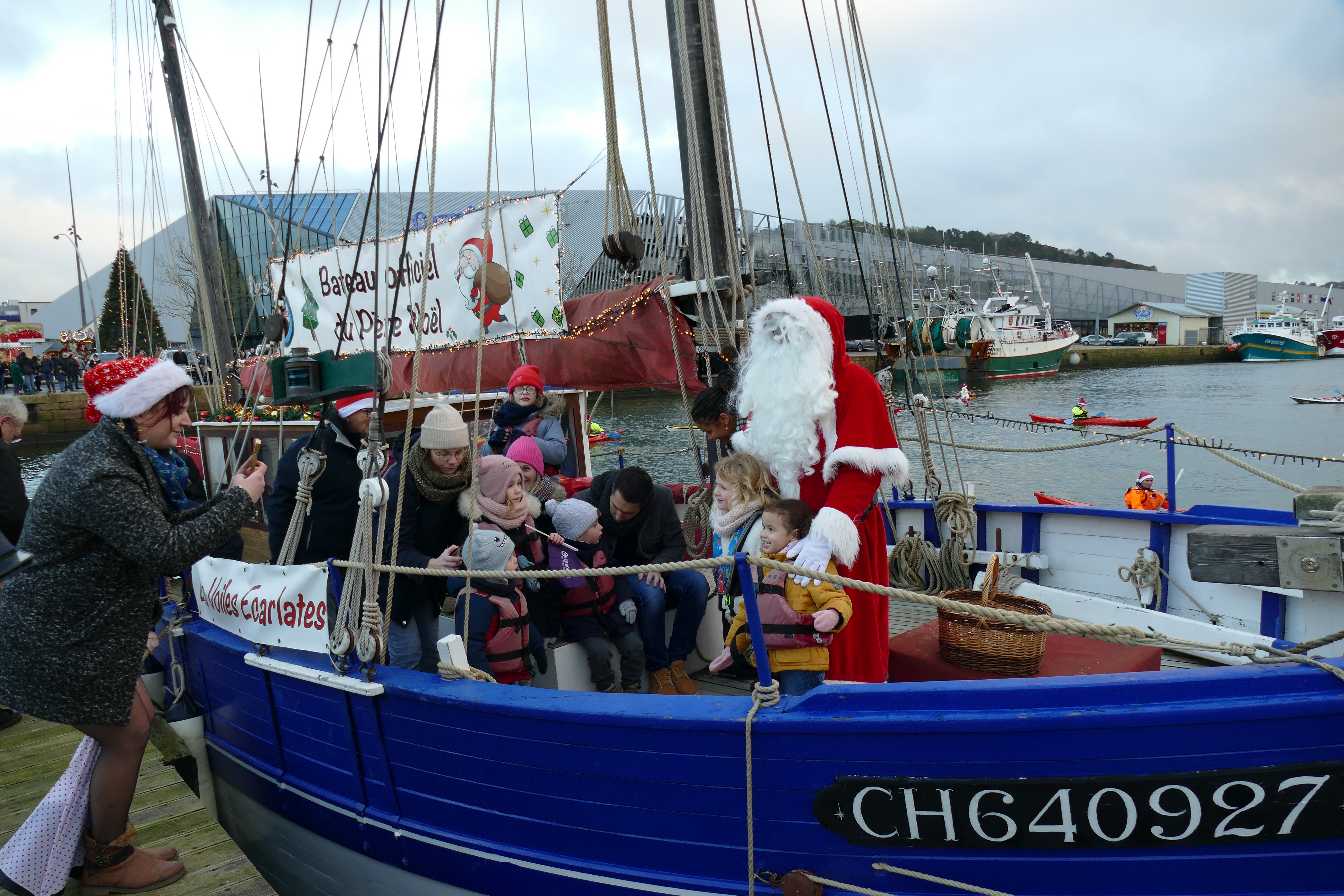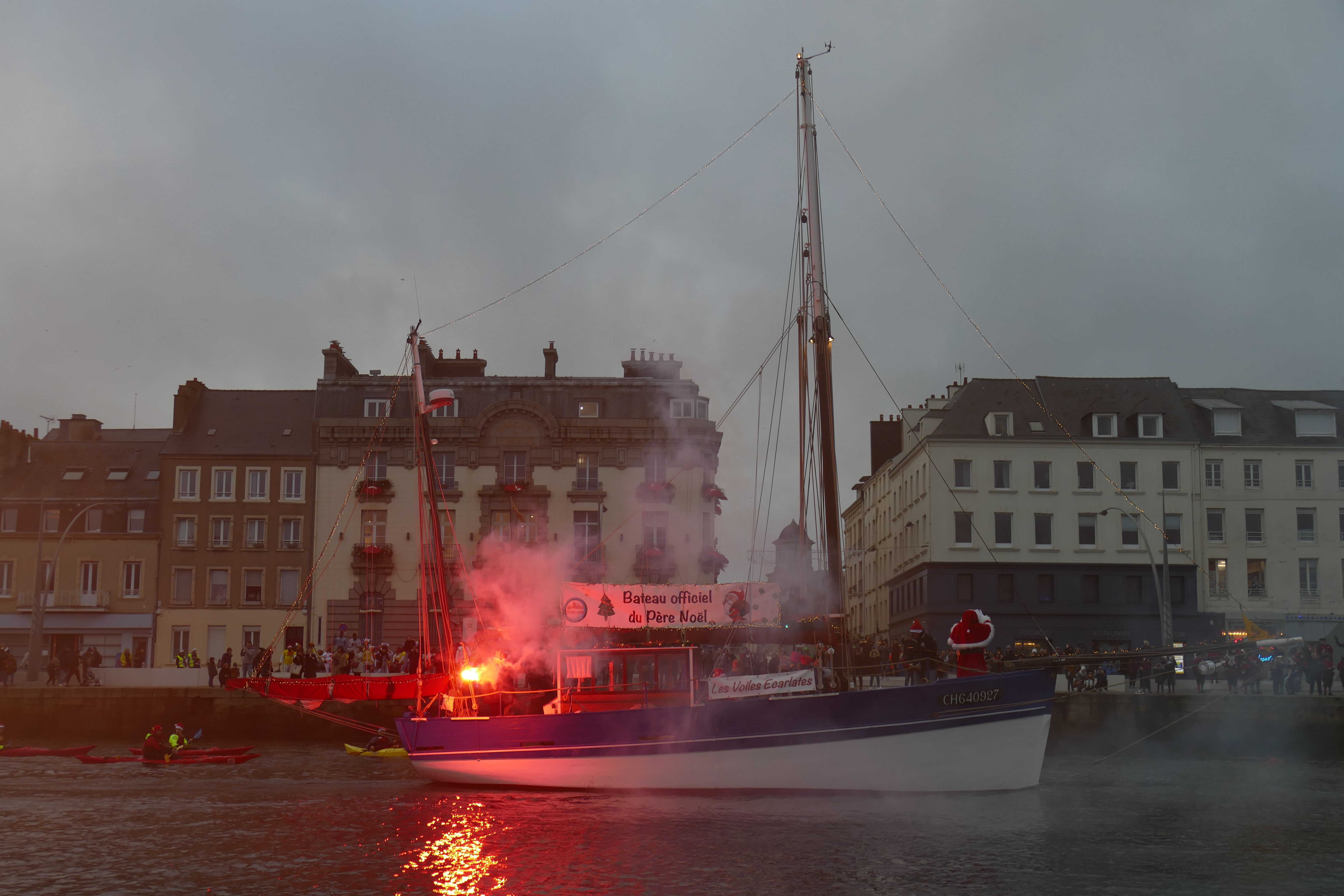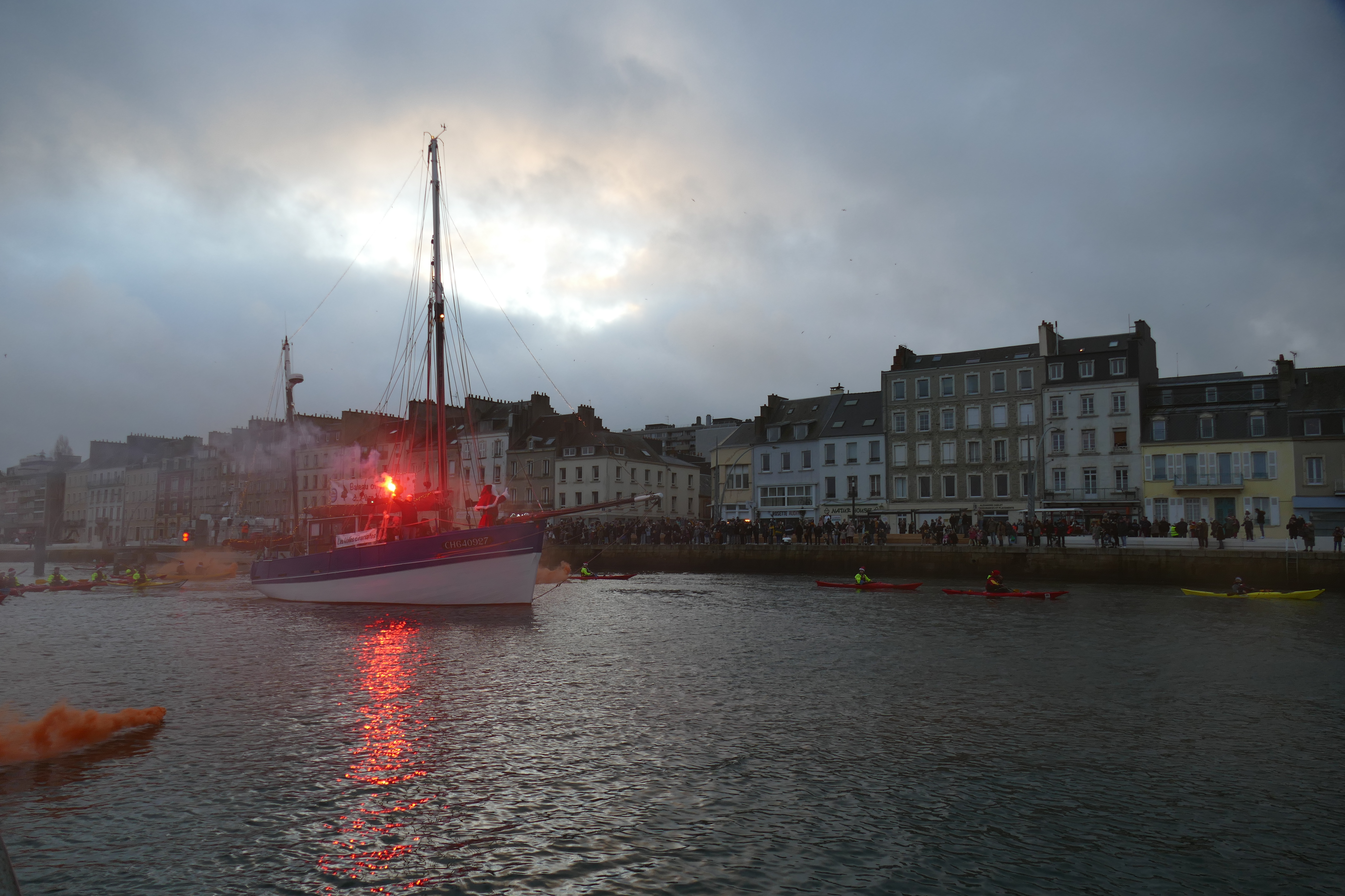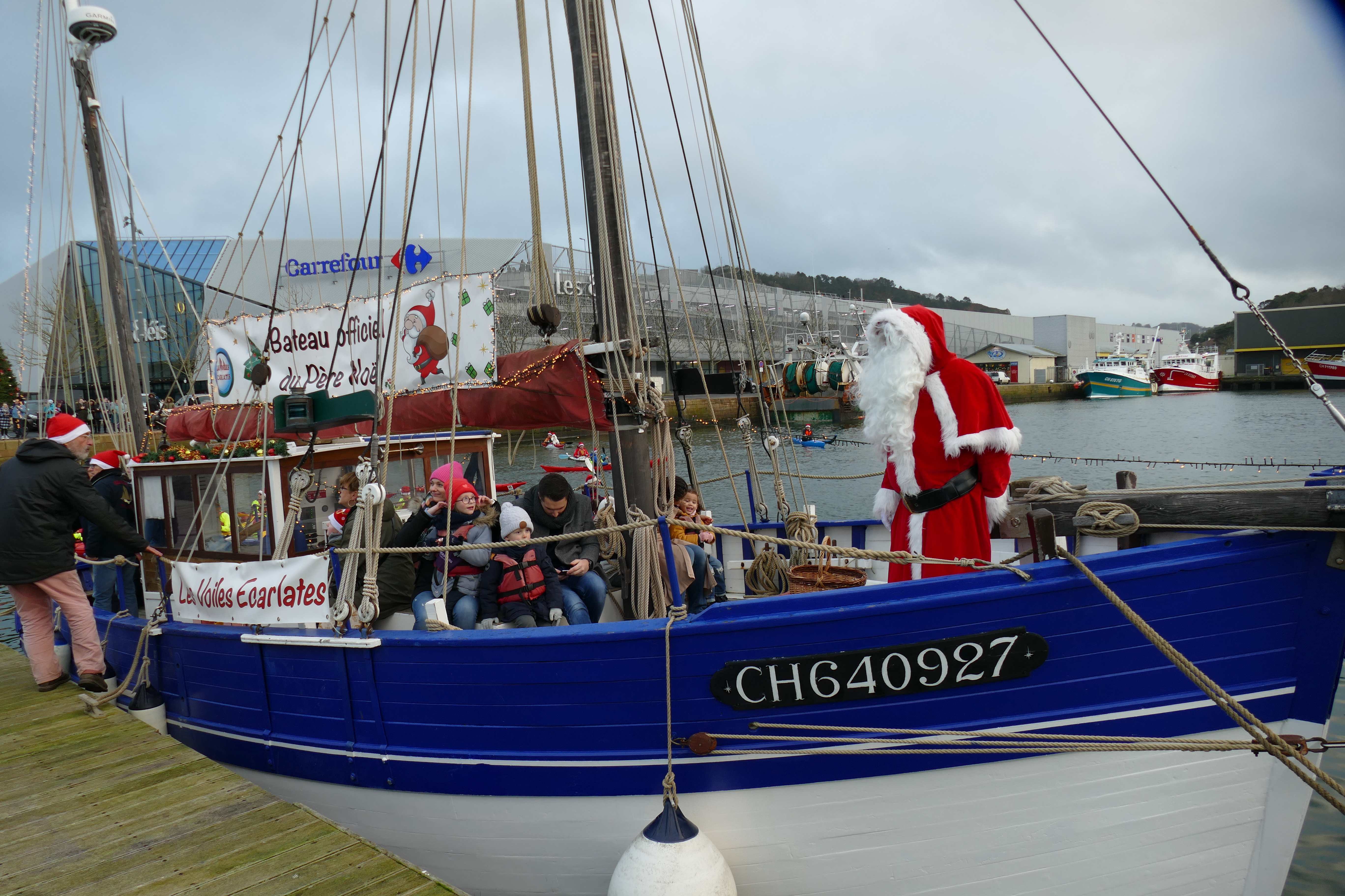 Hier, samedi 23 décembre, il y avait du monde sur les quais autour du bassin du commerce à Cherbourg pour voir embarquer le Père Noël à bord de la Croix du Sud III. Après avoir quitté le ponton de la passerelle Michel Legrand, l’ancien langoustier de Camaret et son illustre passager ont effectué plusieurs boucles dans le bassin en compagnie des lutins – kayakistes avant de se diriger un peu avant 17heures vers l’ouverture du pont tournant et de faire cap vers le Nord, le Père Noël ayant fort à faire du coté des hautes latitudes…
