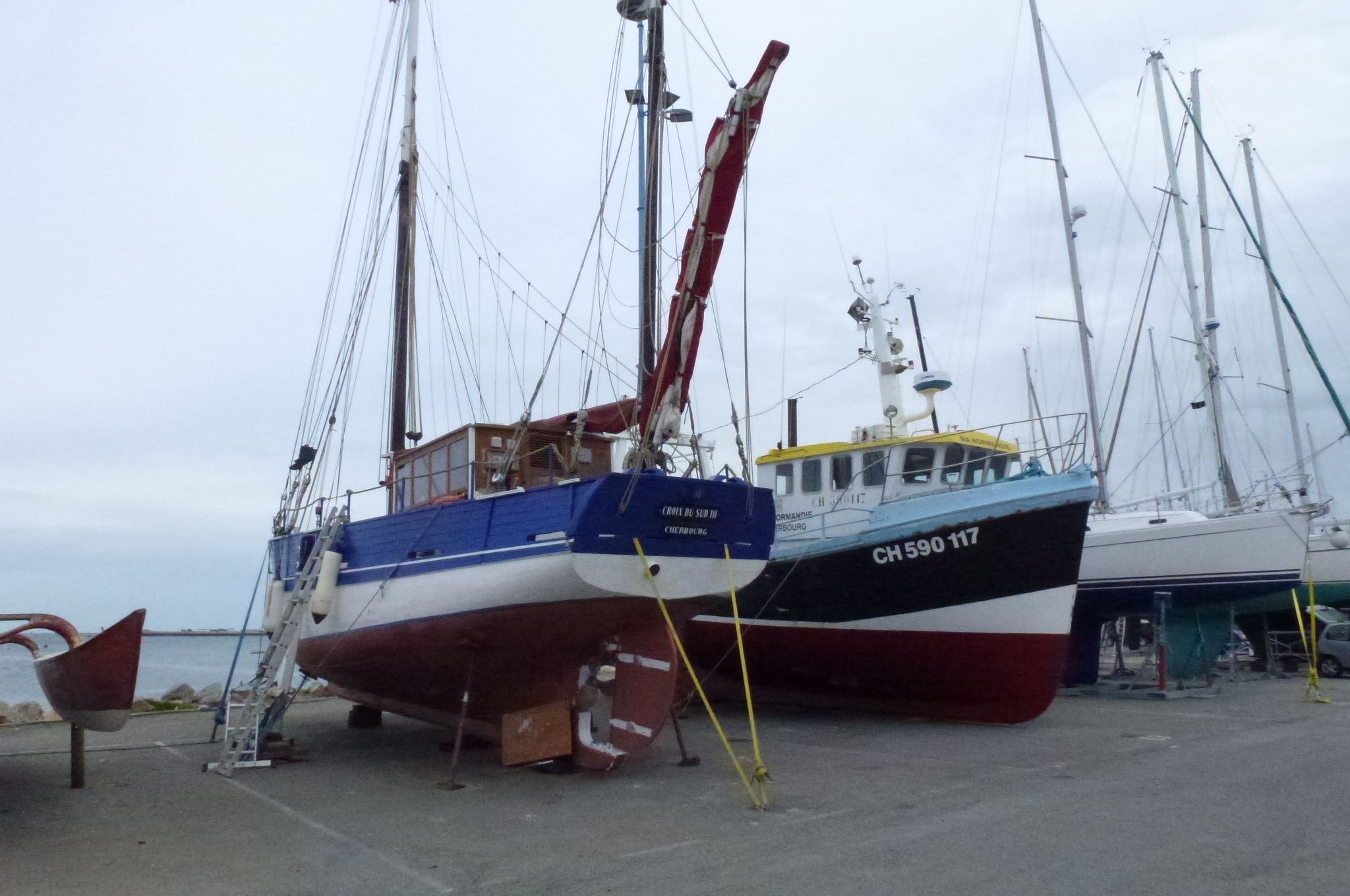 Dans l’après-midi du vendredi 17 novembre, la Croix du Sud III a été sortie de l’eau pour rejoindre la zone chantier de port Chantereyne à Cherbourg. L’équipage de l’ancien langoustier a solidement étayé le bateau qui présente son flanc babord aux vents dominants, pointant ainsi son étrave vers le Nord.