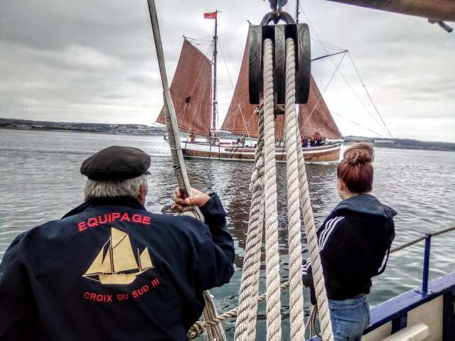 Ce matin, le côtre dundee Croix du Sud III, Lun II, la vénérable galéasse norvégienne d’Ulysse dit « Le Samouraï » et le Surprise du Lycée Professionnel Maritime et Aquacole (LPMA) Daniel Rigolet ont appareillé de Cherbourg à destination du port d’Omonville la Rogue sur la côte Nord de la Hague.