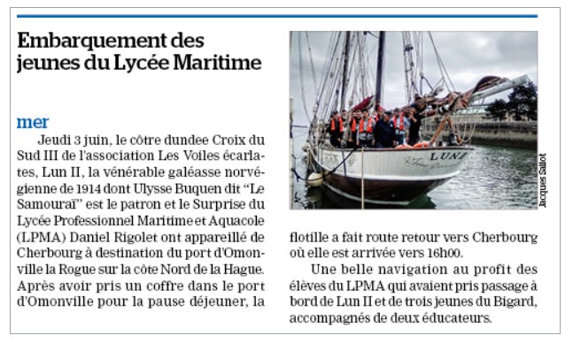 Dans son édition de Cherbourg du samedi 12 juin 2021 (parution le jeudi 10) l’hebdomadaire régional La Manche Libre revient sur la sortie en mer des élèves du Lycée Professionnel Maritime et Aquacole Daniel Rigolet à bord du Lun II d’Ulysse Buquen ainsi que sur l’exercice effectué avec les sauveteurs de la station SNSM de Fermanville.
