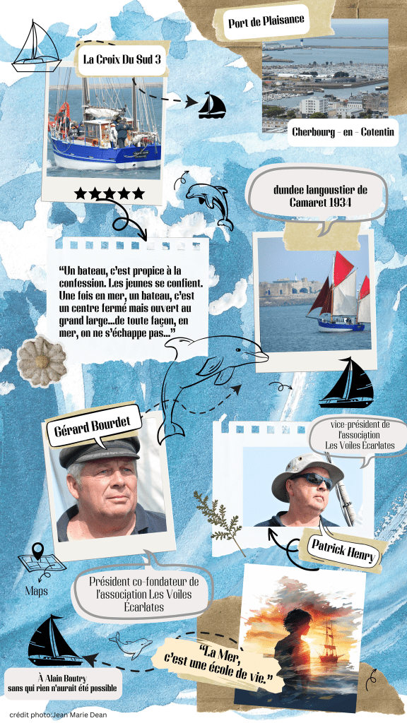 La quatrième de couverture comporte cinq photos où l’on aperçoit notamment la Croix du Sud III tout dessus dans la grande rade de Cherbourg. L’ancien dundee langoustier a fêté ses 90 ans en août dernier à Camaret, port qui l’a vu naître en 1934. Il s’appelait alors « Paul ».