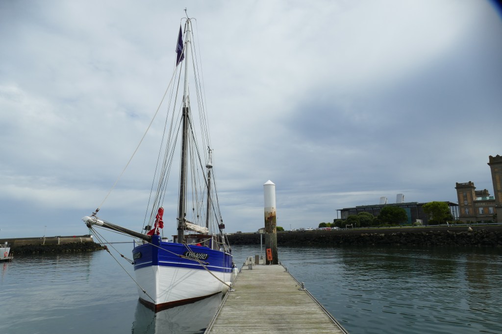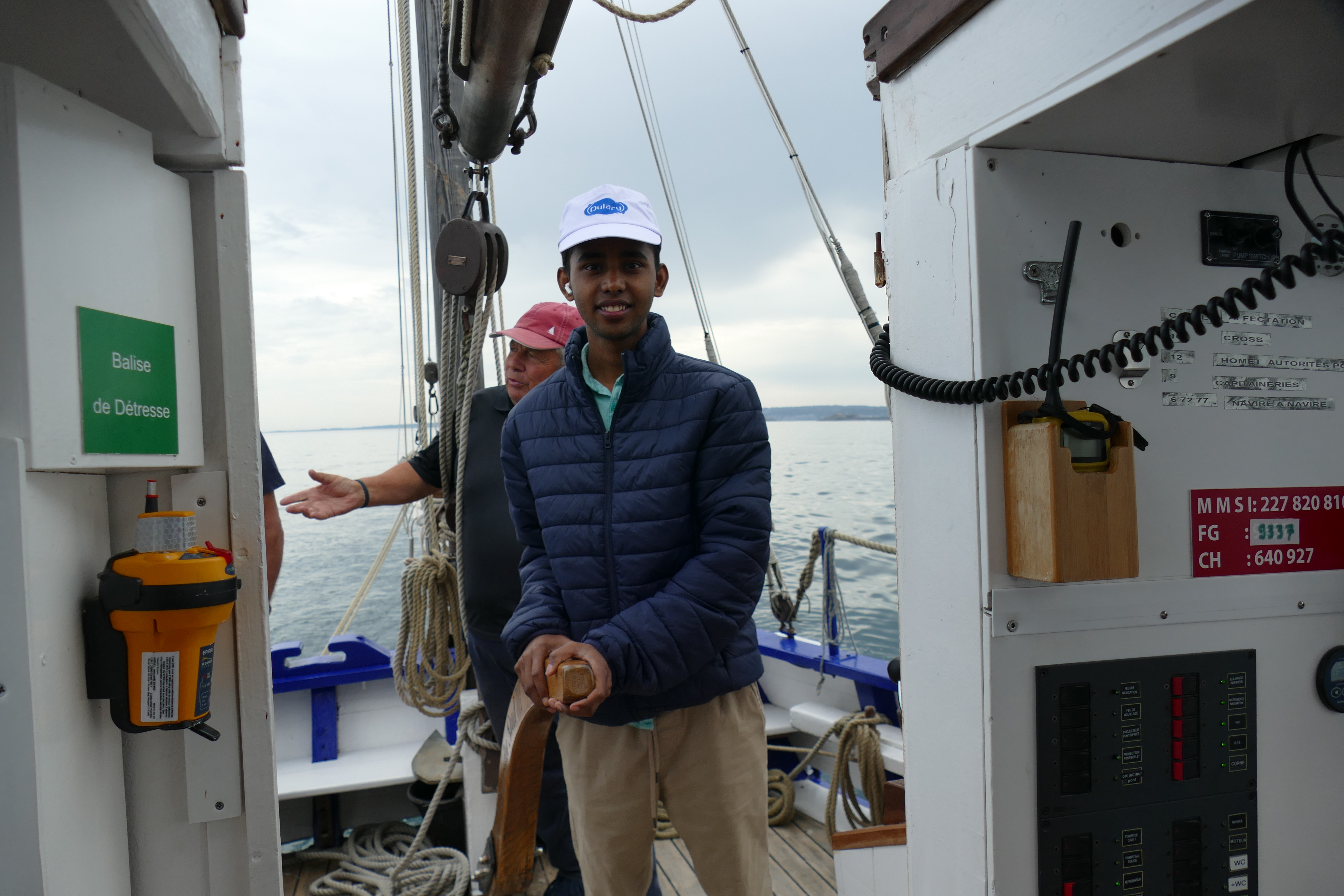 Mijanur, un jeune bengladais a pris la barre puis ce fut le tour de Nouh, un ivoirien et de Alassan, originaire de la Guinée. Vers midi, CDS III s’est amarrée au ponton d’attente de port Chantereyne sur lequel foc et trinquette ont été étalés pour sécher un peu sous le généreux soleil du Cotentin.