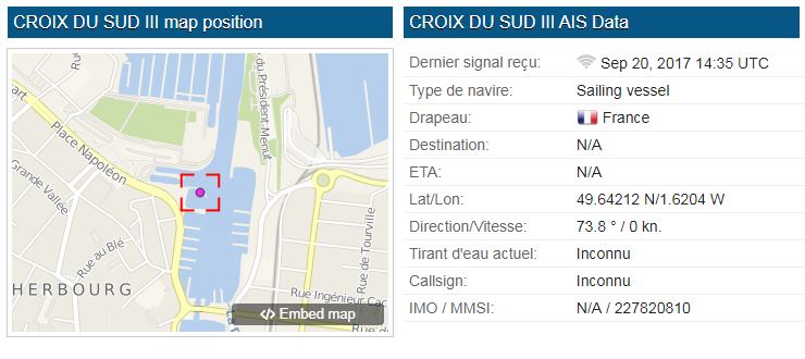 Comme vous le savez, la Croix du Sud III est maintenant dotée d’un émetteur – récepteur A.I.S. (Automatic Identification System) de classe B (puissance 2W) ainsi vous pouvez désormais suivre les mouvements du navire par le biais de sites et d’applications dédiés au suivi du trafic maritime comme, par exemple, Marinetraffic, Findship, ou Vesselfinder