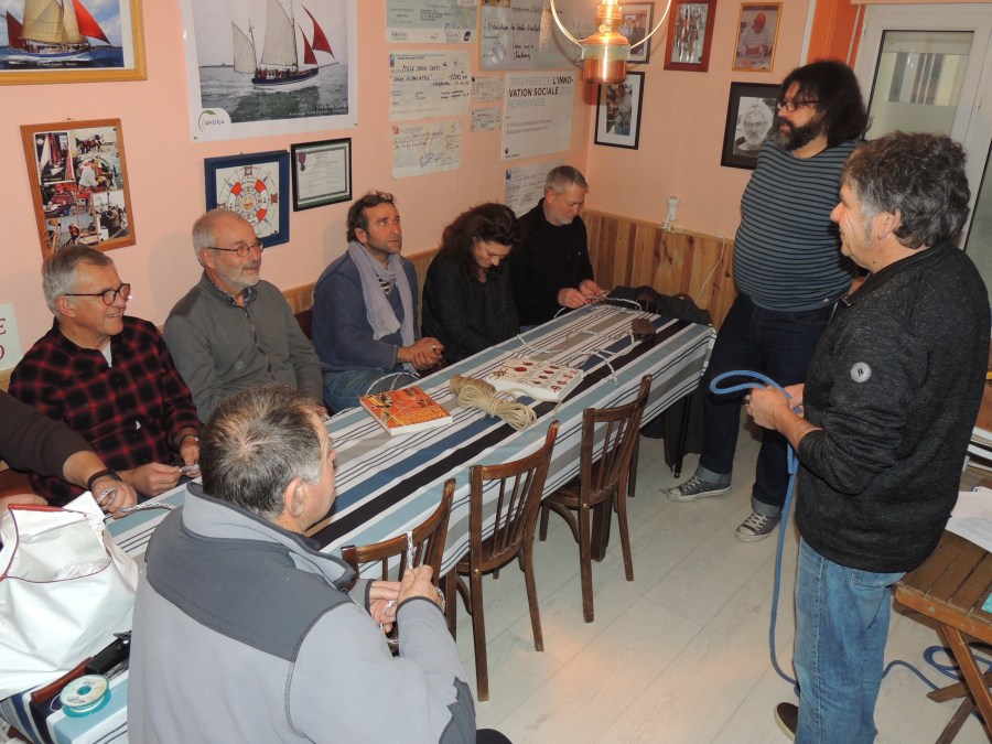 Vendredi 4 janvier, l’ambiance était studieuse à terre, au local de la rue Victor Grignard. Jean-Pierre, second patron de la Croix du Sud III et Pascal le bosco ont familiarisé les présents à la confection de quelques noeuds. Désormais, noeud de chaise, noeud en huit, etc… n’ont plus de secret pour les membres des voiles écarlates qui ont suivi cette démonstration avec attention.