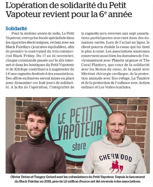 Notre association a été retenue par la société cherbourgeoise Le Petit Vapoteur pour participer, pour la première fois cette année, aux Black Fairdays aux cotés de six autres associations. Depuis vendredi dernier et jusqu’au vendredi 24 novembre 23h59, les achats des clients donne lieu à une collecte dont le montant global a déjà dépassé , au moment où nous écrivons ces lignes, 200 000 €.