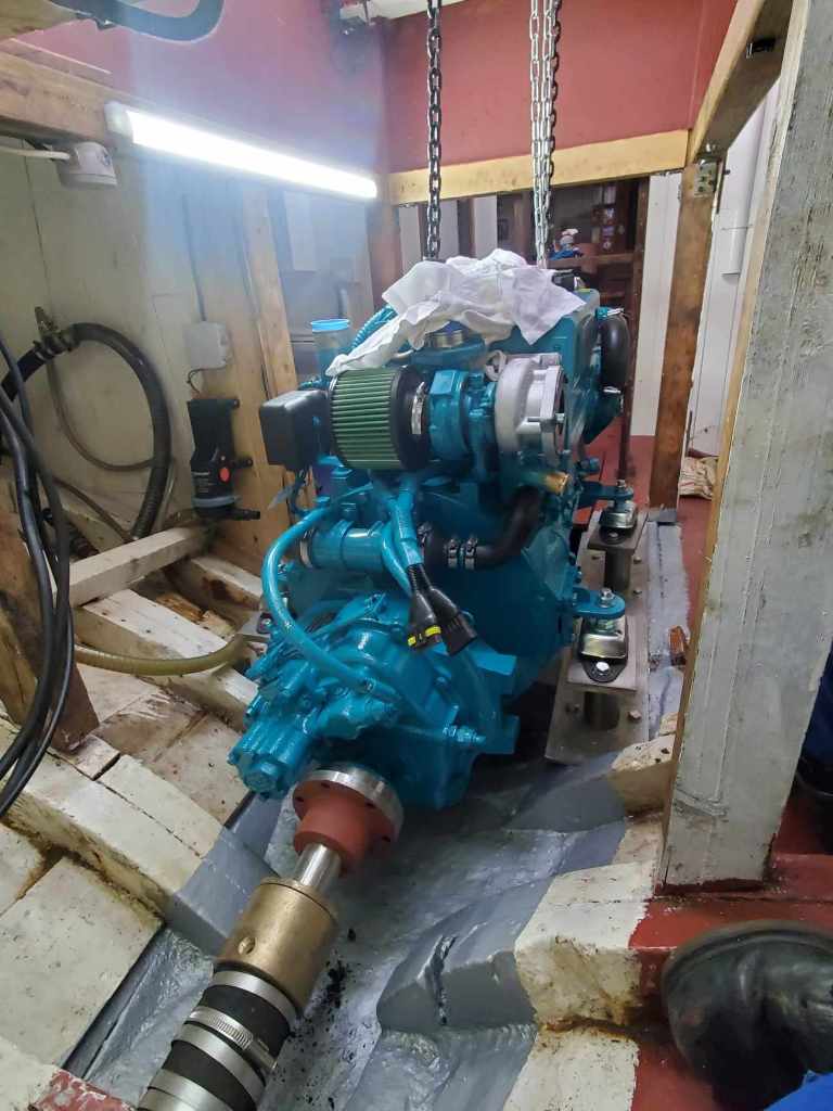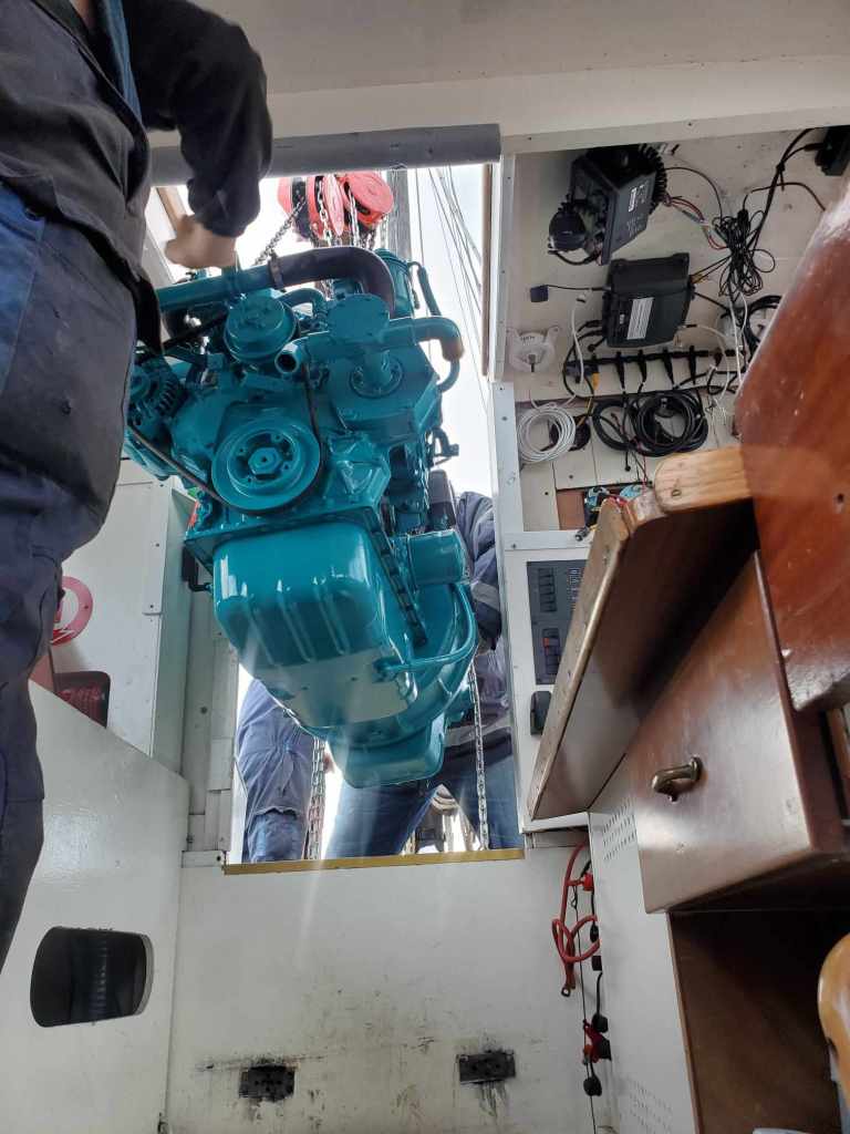 Le nouveau moteur est désormais à bord. Crédits photos Dominique Raimbault/Voiles écarlates