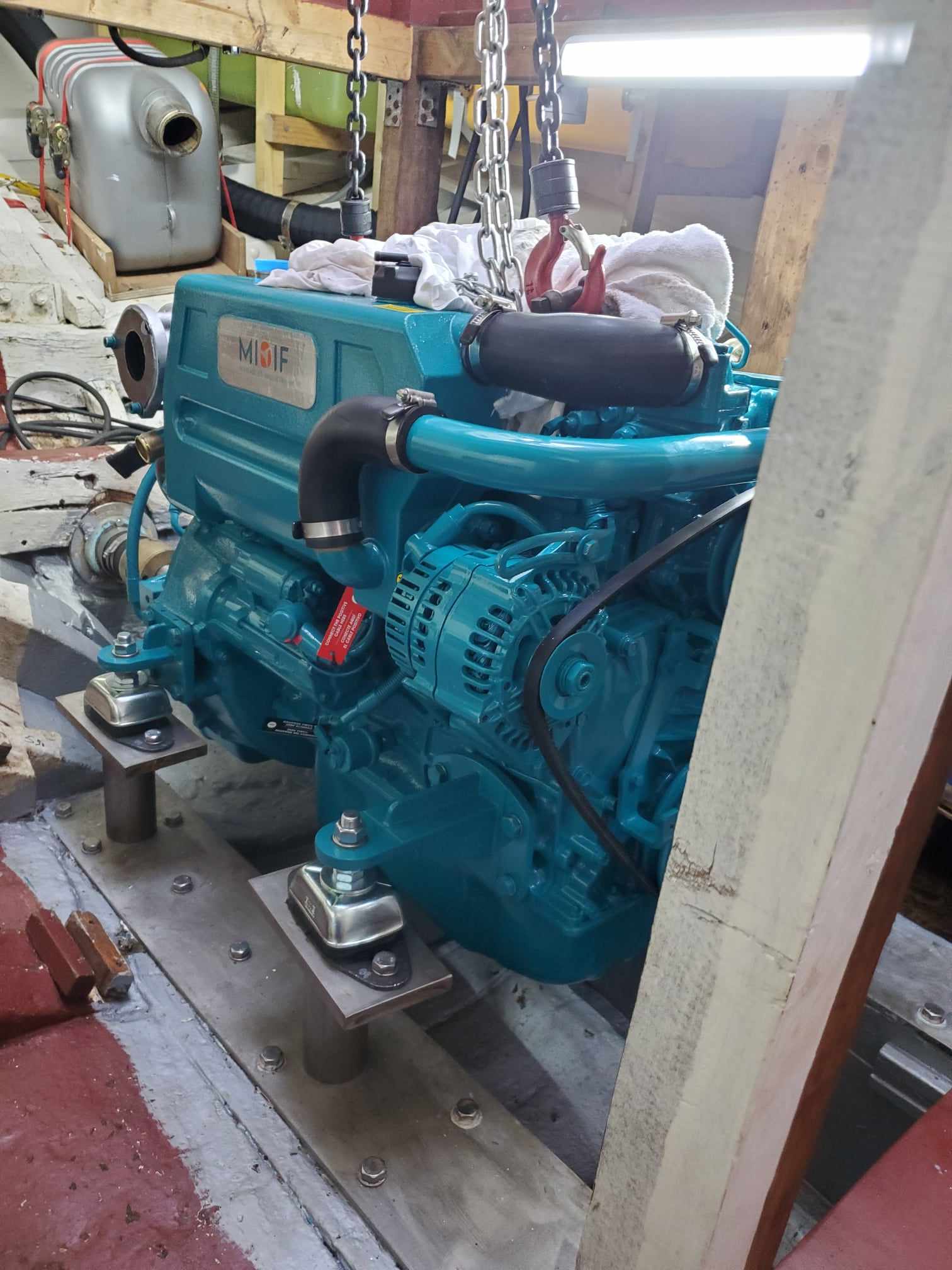 Il s’agit d’un moteur MD 3301 Midif Mitsubishi 93 cv avec reducteur TM170 Twin Disc ratio 2,94. Par ailleurs, prélignage pour relevé de cotes réhausses supports moteur – repérages position filtre eau de mer et tuyauteries gas oil effectués.