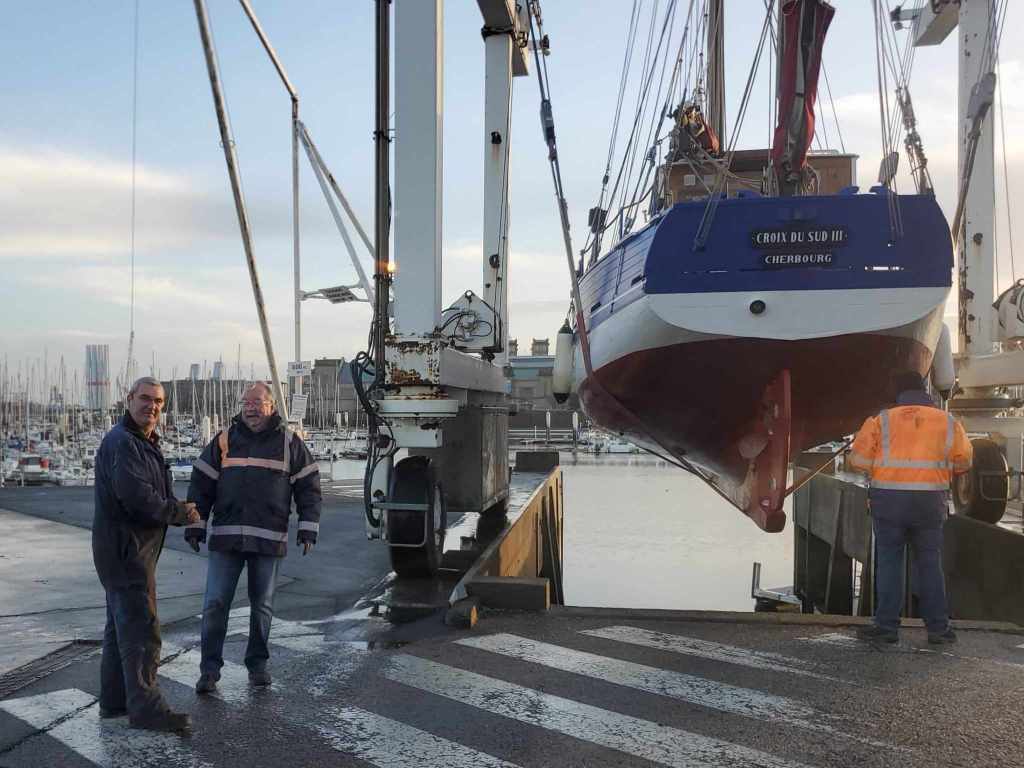 Dans l’après-midi du vendredi 17 novembre, la Croix du Sud III a été sortie de l’eau pour rejoindre la zone chantier de port Chantereyne à Cherbourg. L’équipage de l’ancien langoustier a solidement étayé le bateau qui présente son flanc babord aux vents dominants, pointant ainsi son étrave vers le Nord.